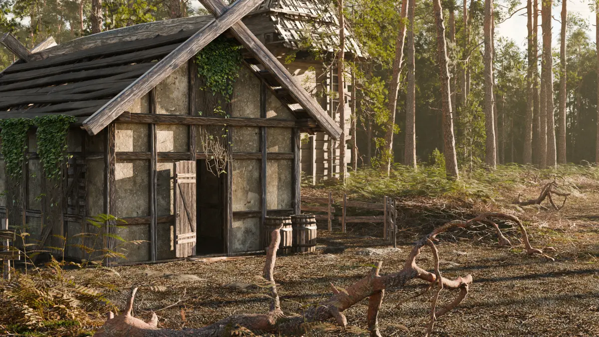 ** Scene Overview**This scene represents a serene and slightly abandoned forest environment, rendered with high realism using Blender 4.2. The focal point is a weathered wooden cabin nestled within a dense pine forest, conveying a rustic, perhaps post-apocalyptic or fantasy mood.