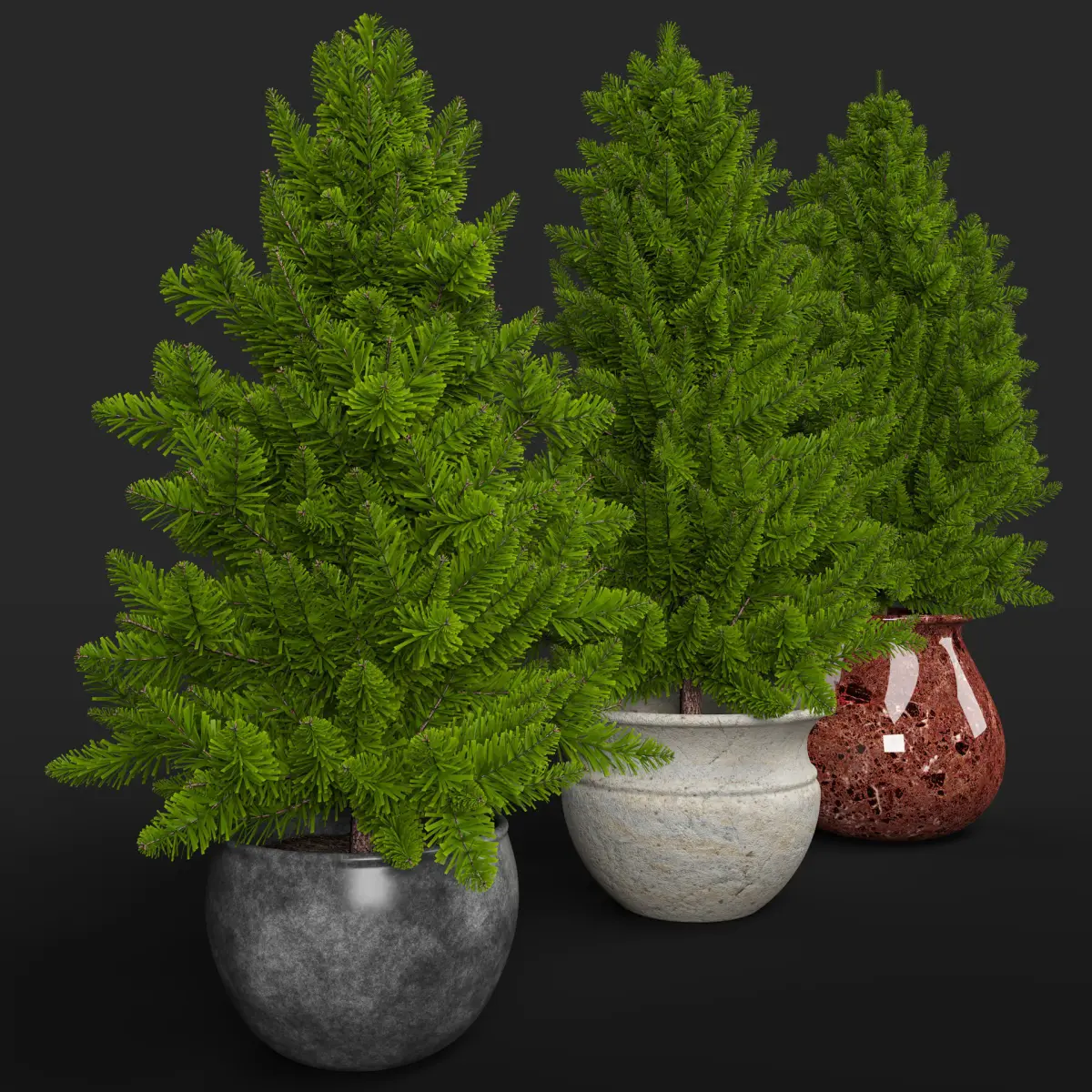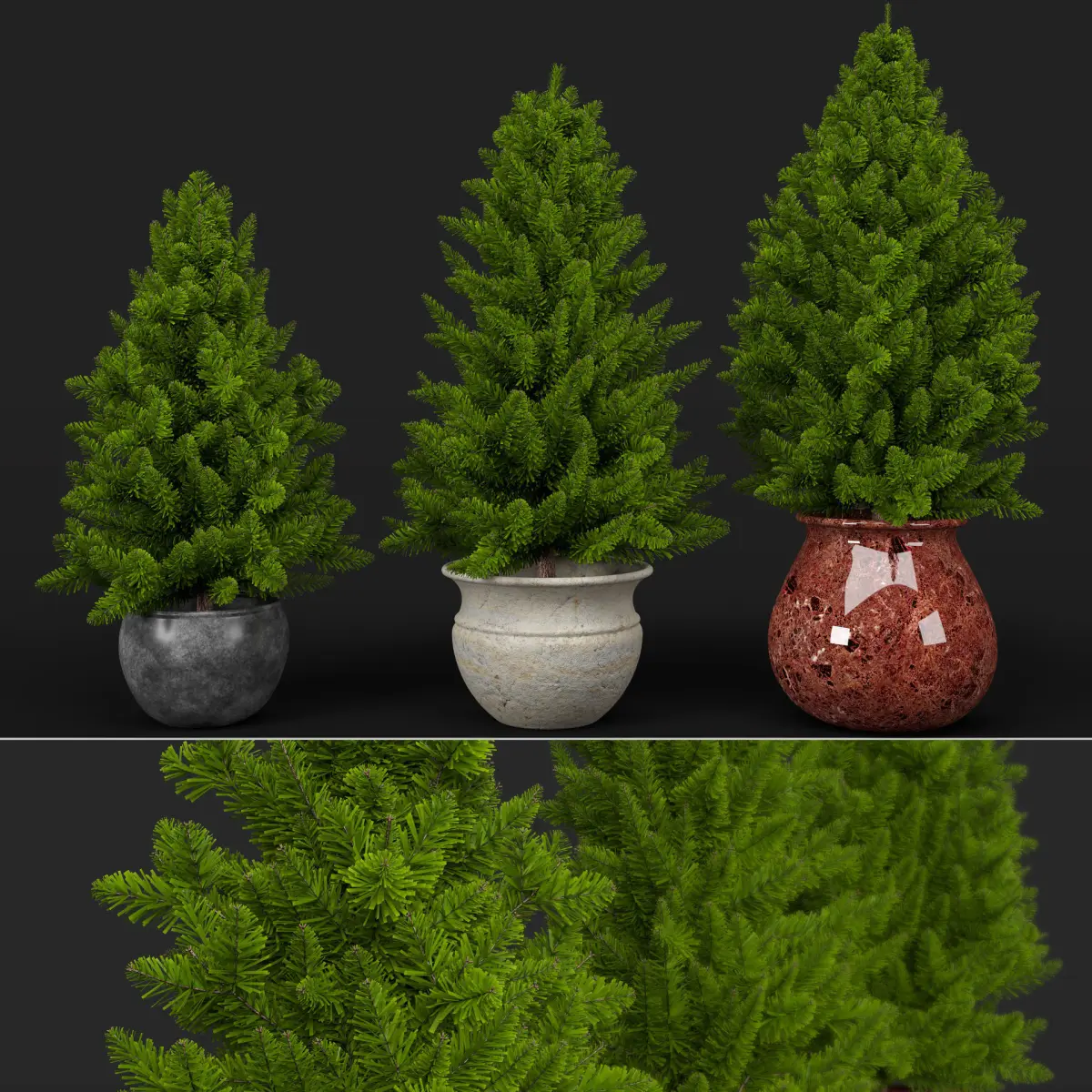 In the archive you will find 3 different models of pine and 3 pots with 3 materials (marble, plastic, stone).The 3d model is well detailed and can be used both for close up renders and for distance renders.All textures, objects and materials are renamed to the correct names. Real-scale model: scene in centimeters.Models' heights: 115 cm, 140 cm, 150 cm
