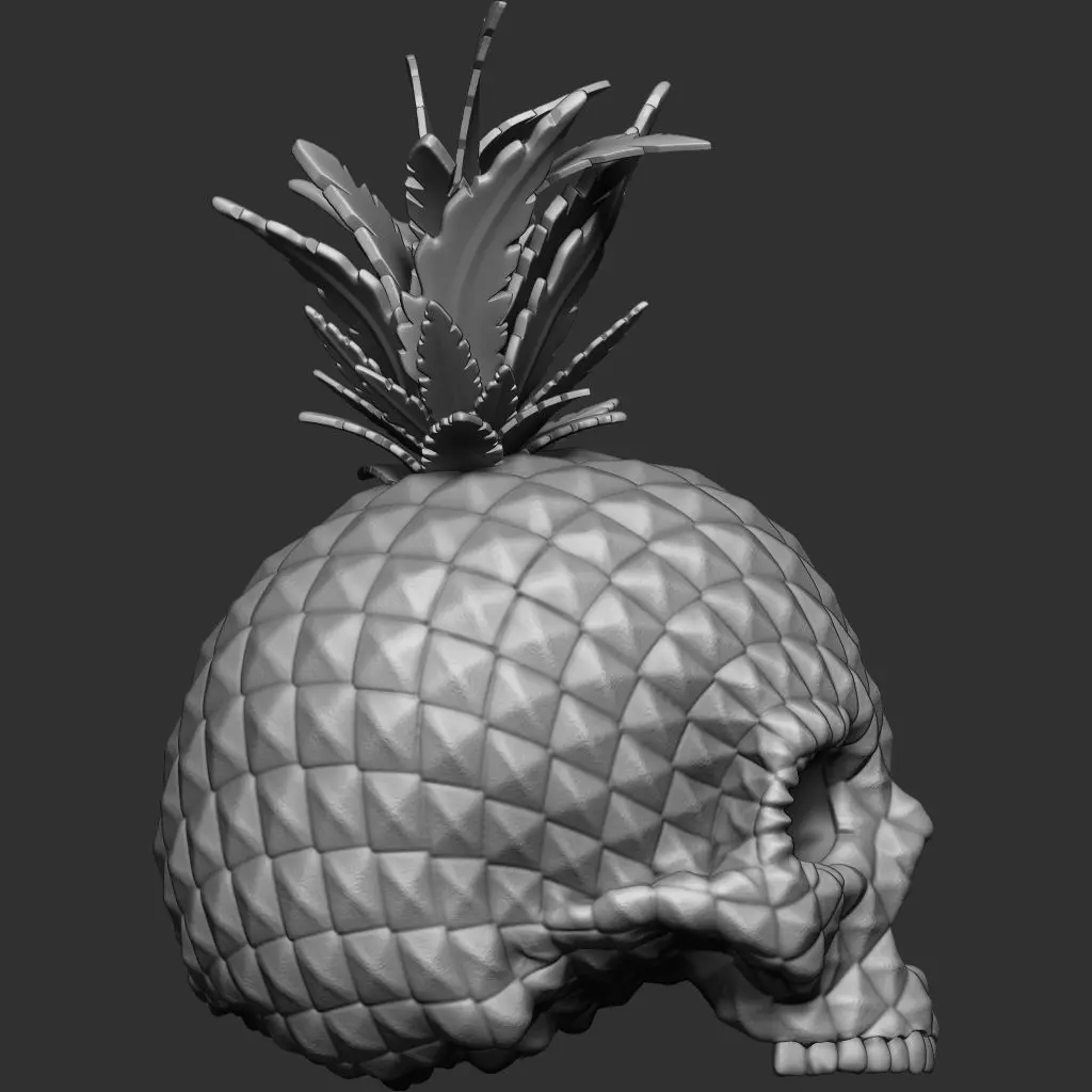 This piece can be used as a decorative item, conversation starter, or even as wall art, depending on its intended purpose. It symbolizes a juxtaposition of life and death, seriousness and humor, making it ideal for those who appreciate eccentric and unconventional designs.The 3D model depicted in the image is a creative fusion of a human skull and a pineapple. This unique design blends the macabre symbolism of mortality with the playful and tropical aesthetic of a pineapple. The model features intricate detailing on the skull, capturing its anatomical structure, while the pineapple top adds a whimsical and unexpected twist.ple. This unique design blends the macabre symbolism of mortality with the playful and tropical aesthetic of a pineapple. The model features intricate detailing on the skull, capturing its anatomical structure, while the pineapple top adds a whimsical and unexpected twist.