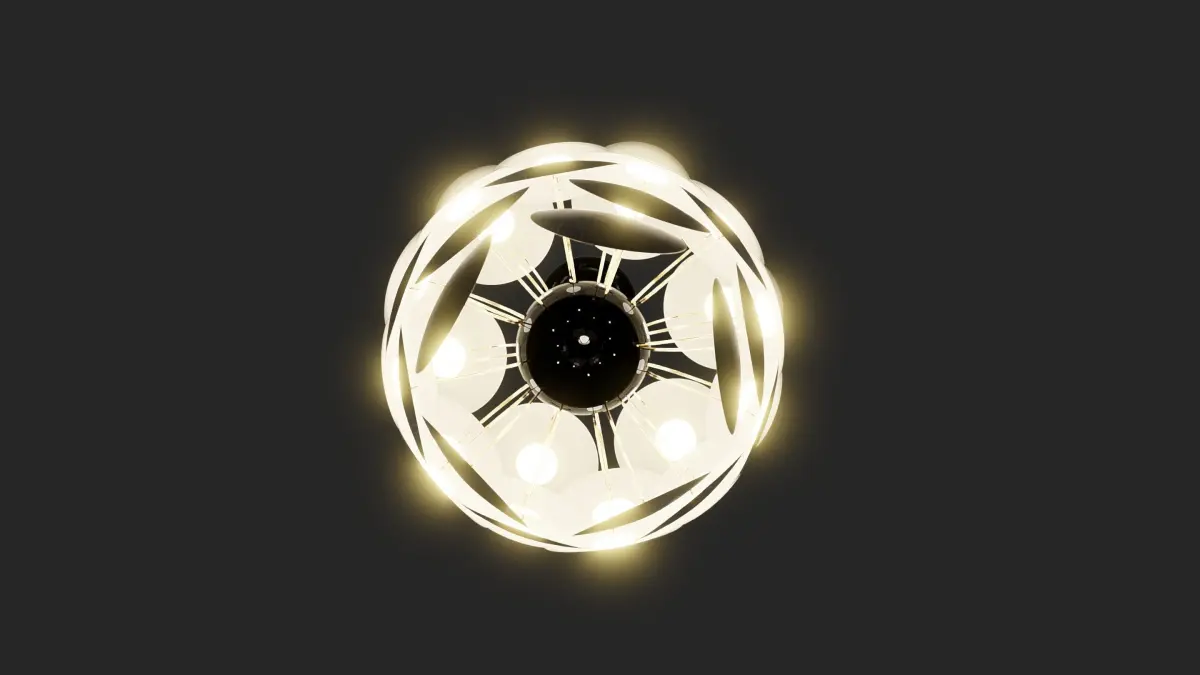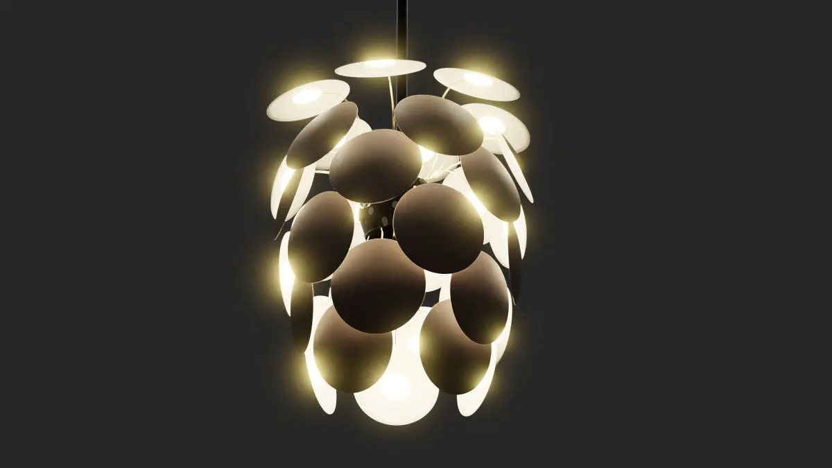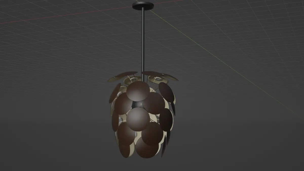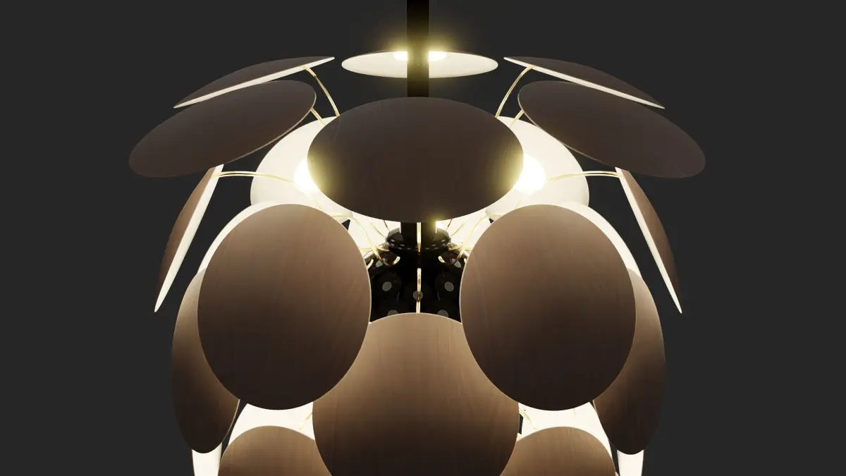 A unique chandelier design that evokes the image of a pinecone. Approximately 9'2tall and 4'2.25 diameter upon delivery, designed for large rooms. Can be easily adjusted to fit different sizes. UVs are only on the wooden discs, allowing the hanging pole to be sized without any texture deformation.