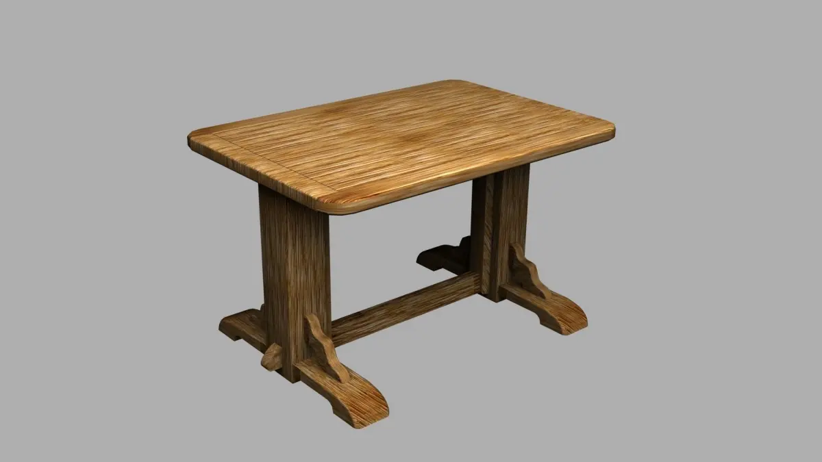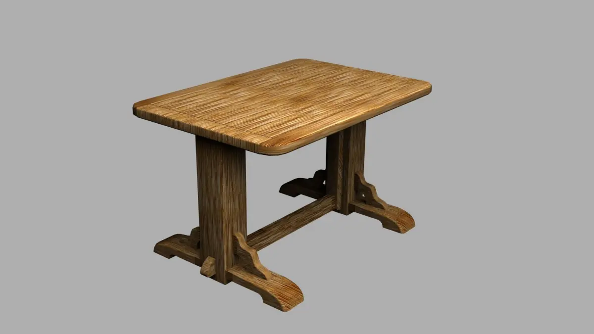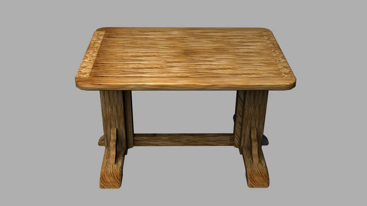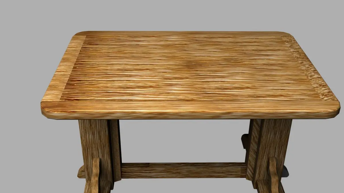 Pinewood Table 3D model. Here provided an idea of a model which is flexible to use: model is made from different blocks,each block textured by the same texture using different scale and rotation which gives effect of not repeated and realistic elements which look harmoniously all together. Just one texture used. Such approach gives you an opportunity: