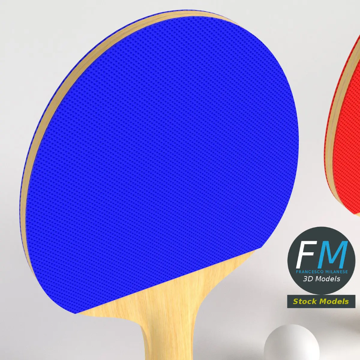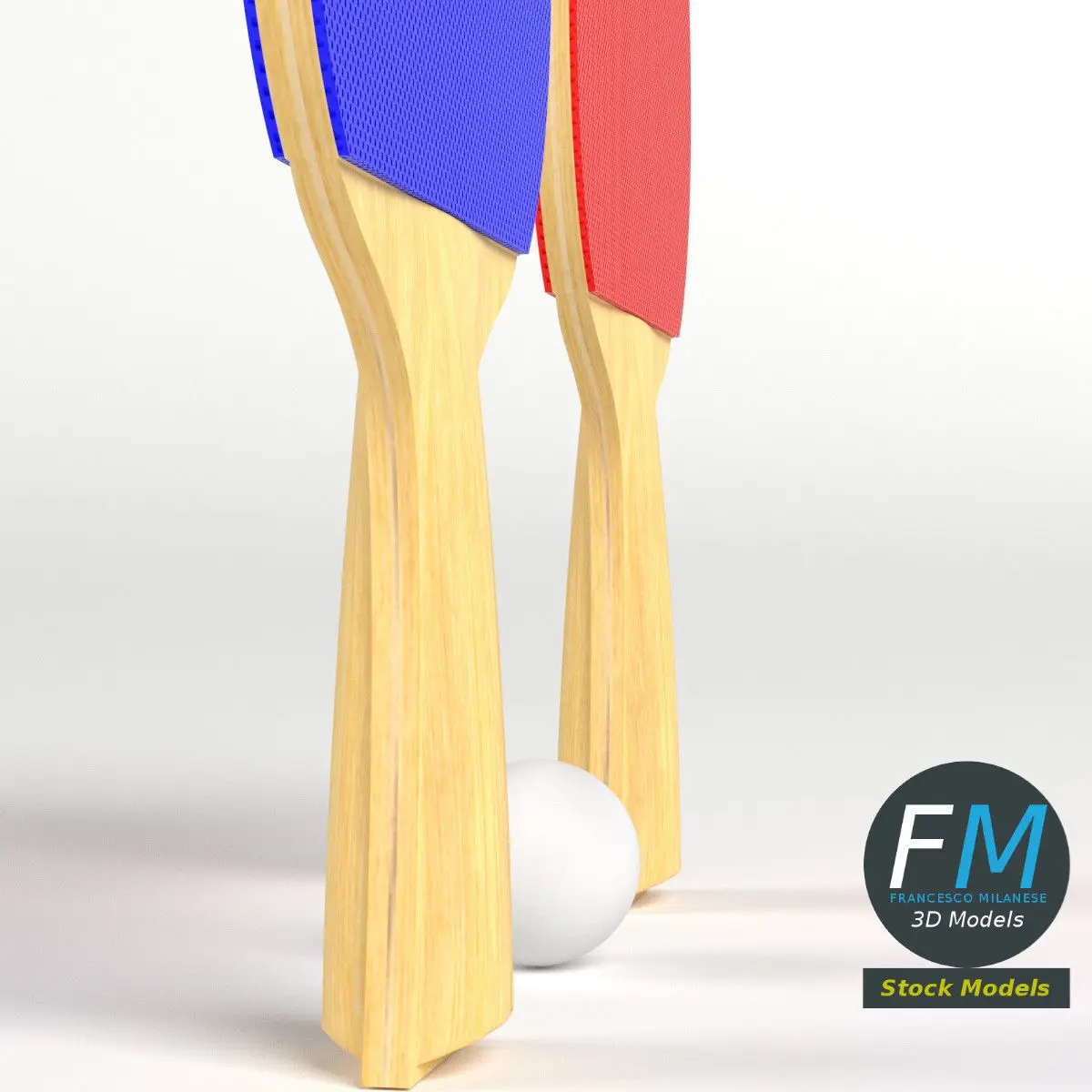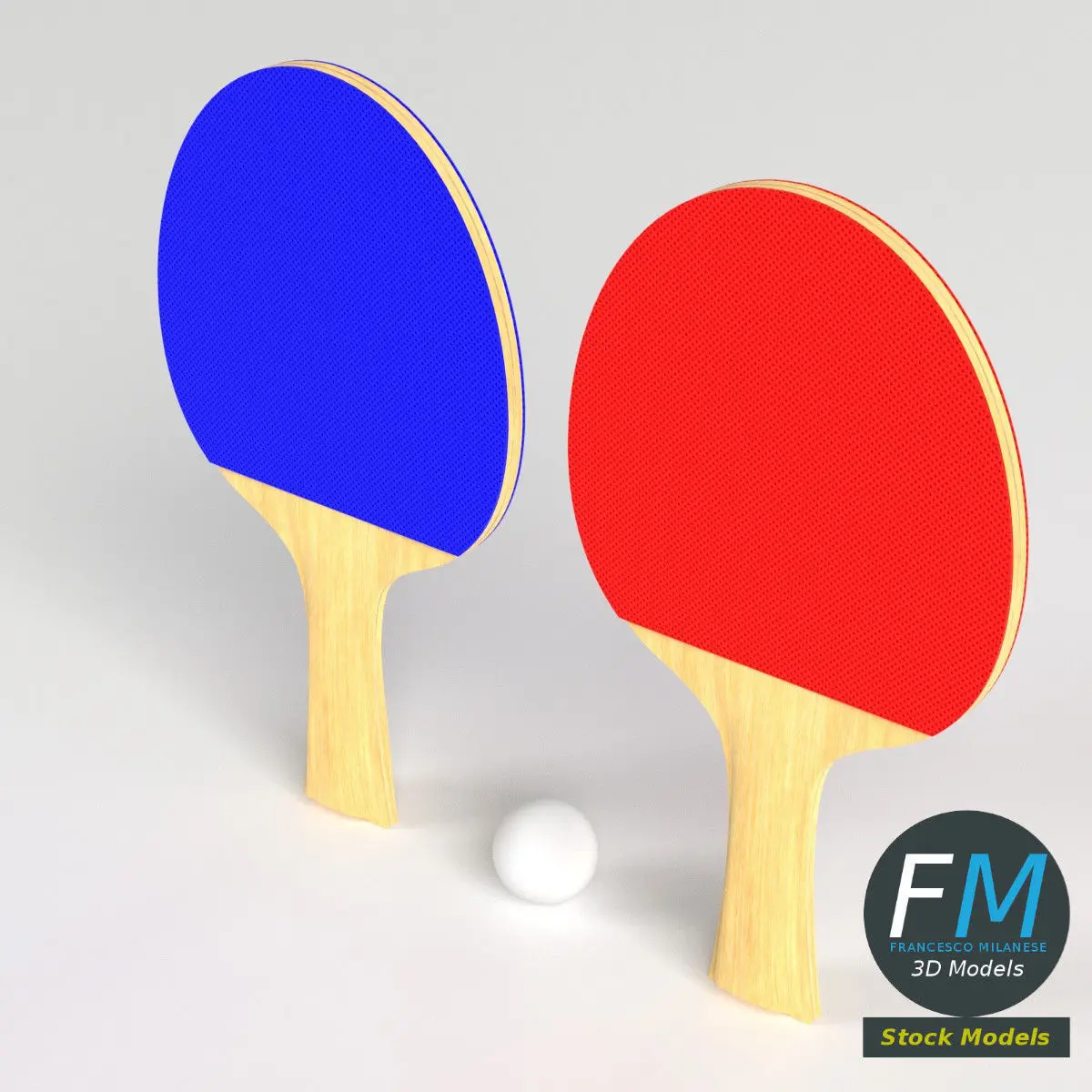 A set of two ping pong paddles and a ball; each paddle has its own Material and PBR Textures set. Production-ready 3D Model, with PBR materials, textures, non overlapping UV Layout map provided in the package.