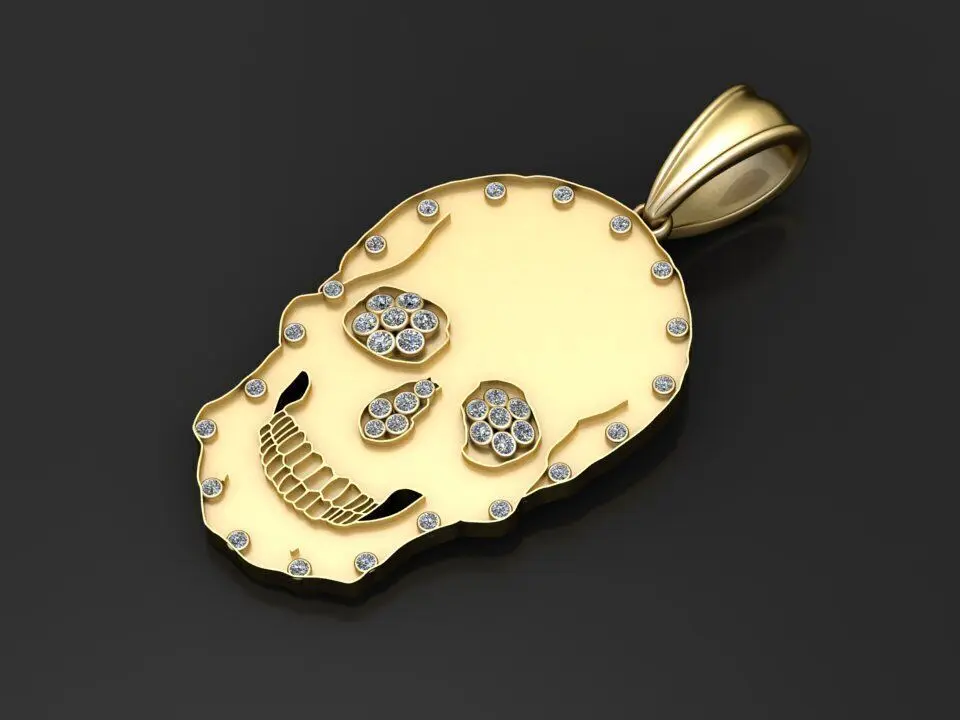 This striking 3D model presents a pair of bold skull-shaped pendants in polished gold and white metal finishes. Designed for a standout, edgy aesthetic, each skull features precision-set diamonds along the eyes, nose, and perimeter, giving the design a luxurious, rock-inspired twist. Fine detailing around the teeth and contours of the skull adds depth and realism, while the high-polish surfaces ensure maximum reflectivity. Perfect for high-fashion jewelry lines, custom urban accessories, or statement pieces for digital marketing and 3D printing applications.