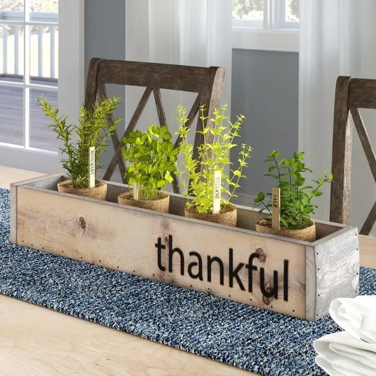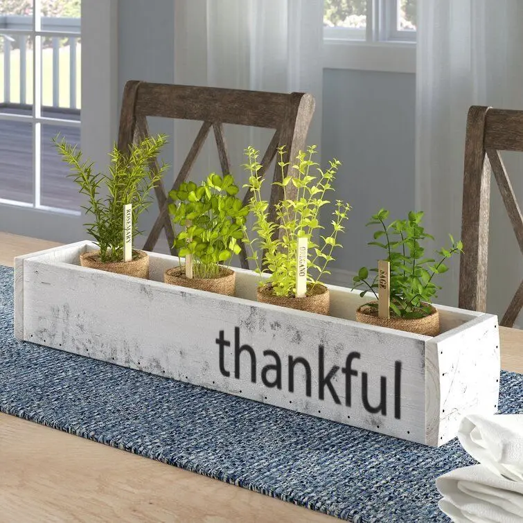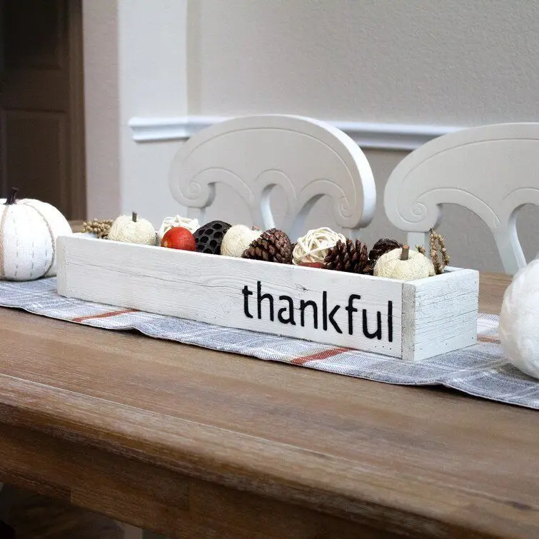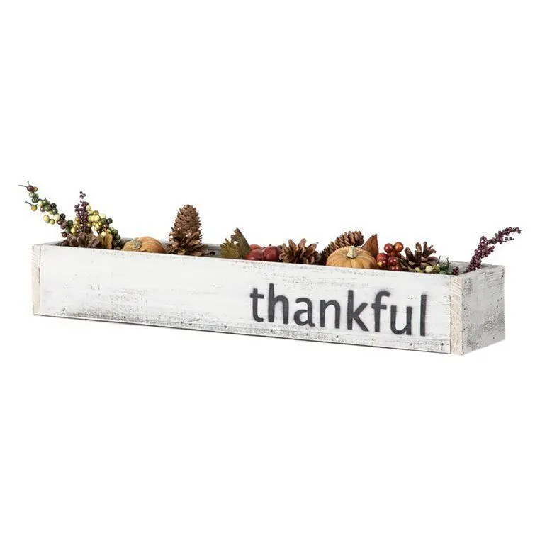 - Wood Tray Centerpiece Box 'Thankful' Accent rustic wooden centerpiece box is perfect for weddings, special events or home decor. The 'thankful' script on the side contrasts against the natural wood tone. Because it is made from reclaimed wood, each piece will be unique and have some variance in overall appearance and colour.