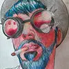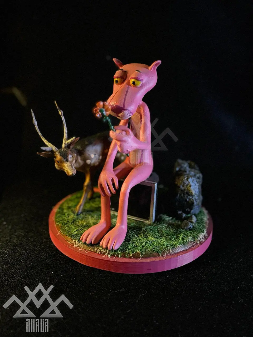 This artistic piece features a character inspired by the iconic Pink Panther, depicted in a reflective and melancholic pose, sitting on a stool while delicately holding a withered flower. The expression of sadness and contemplation on its face provides a powerful visual narrative, perfect for those seeking pieces with meaning and character.