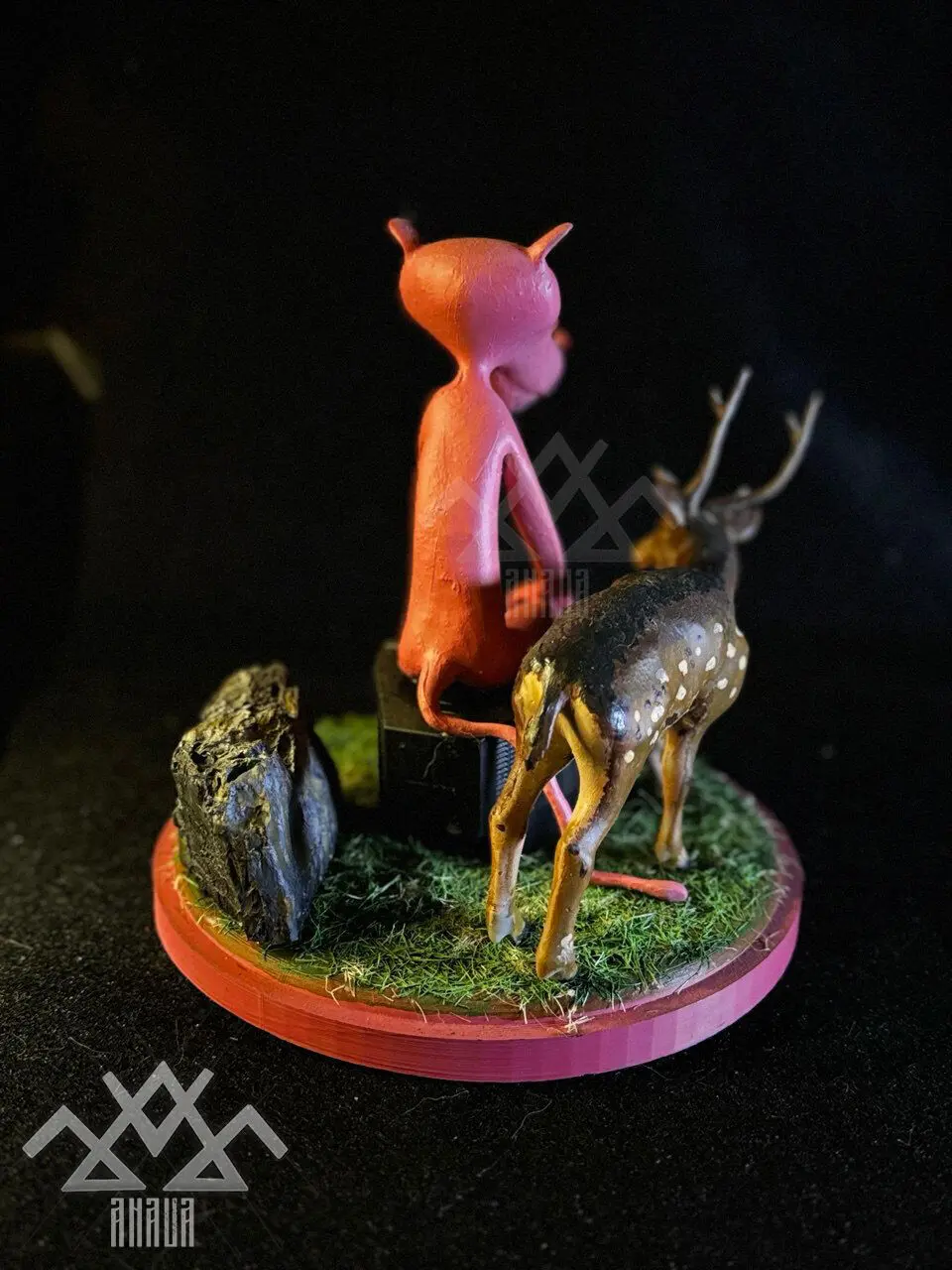 Main Character: The figure is meticulously sculpted to capture a downcast and thoughtful expression, adding a layer of emotion that transcends mere decorative appeal. Composition and Atmosphere: Seated on a simple stool, the character is surrounded by a realistically spotted deer and a dark animal (possibly a crow), creating a symbolic contrast between innocence and melancholy. The arrangement of the animals enhances the sense of solitude and introspection. Textured Base: The scene rests on a circular base with a realistic grass finish, bringing a touch of nature and depth to the set, making the entire scene come to life. Versatility of Use: Ideal for collectors, fans of introspective art, or as a striking decorative piece in any space.