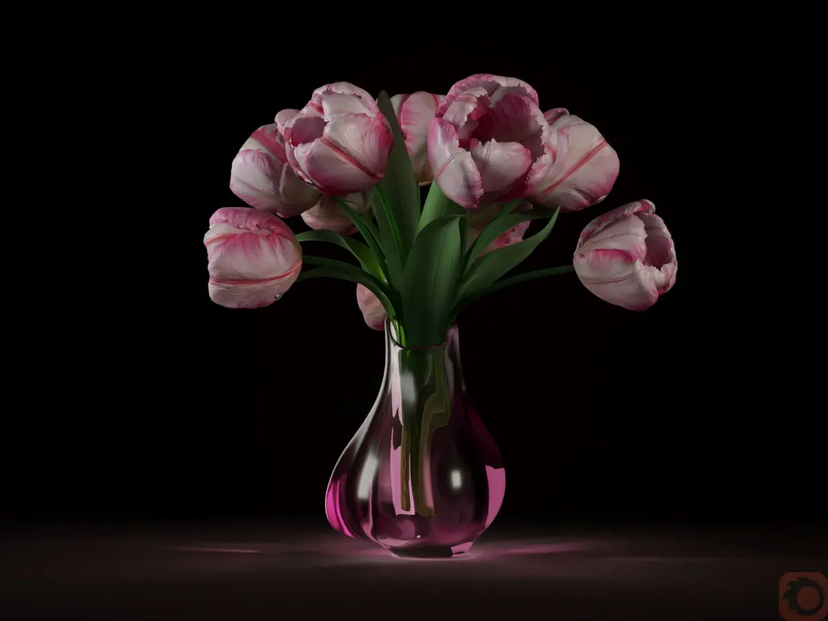 The model of tulips in a glass vase for interior visualization.