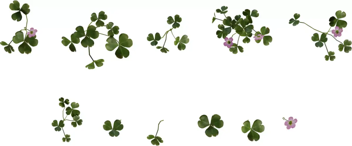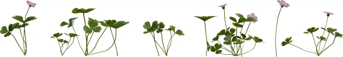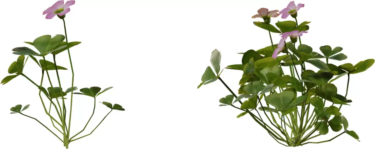 This pack features multiple variations of pink wood sorrel style flowers with delicate three‑leaf clover foliage, ideal for adding small‑scale color to natural scenes. Each plant is modeled with clean low‑poly stems and leaves, then arranged into individual clumps and single sprigs that are easy to scatter across meadows, paths, and garden beds. The models use PBR textures for leaves and petals, including color, roughness, normal, and opacity maps to preserve thin edges and soft translucency. Top‑down and side silhouettes remain readable even at distance, making the assets suitable for both close‑up shots and dense ground‑cover in game environments. Geometry is UV‑unwrapped and organized so you can quickly assign materials in major DCC packages and real‑time engines. This flower set is perfect for stylized or semi‑realistic outdoor levels, archviz gardens, and environment concept scenes that need lightweight, plug‑and‑play vegetation.