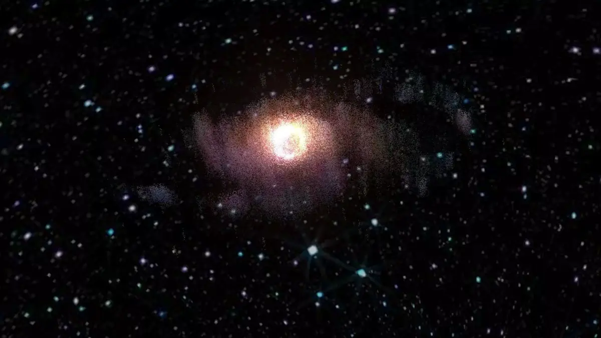 Model is a set of particle systems with elements of different types. Since real Pinwheel Galaxy contains hundreds of billions stars, there are no way of simulate realistic view of galaxy directly. So here used textured particles with complex materials, placed along structural parts of Galaxy. Some of them are “clouds” of stars, others are light absorbing dust, emitting hydrogenous clouds, individual super-giant stars, etc. Multi-layered complex shaders was specifically designed to retain detailed and realistic view with extreme closeup and inside-the-galaxy views