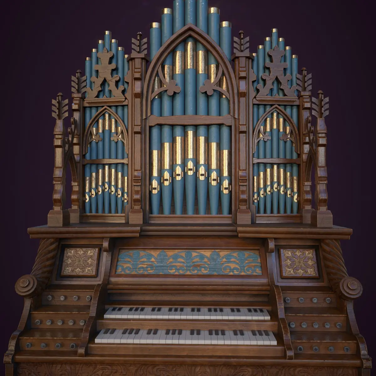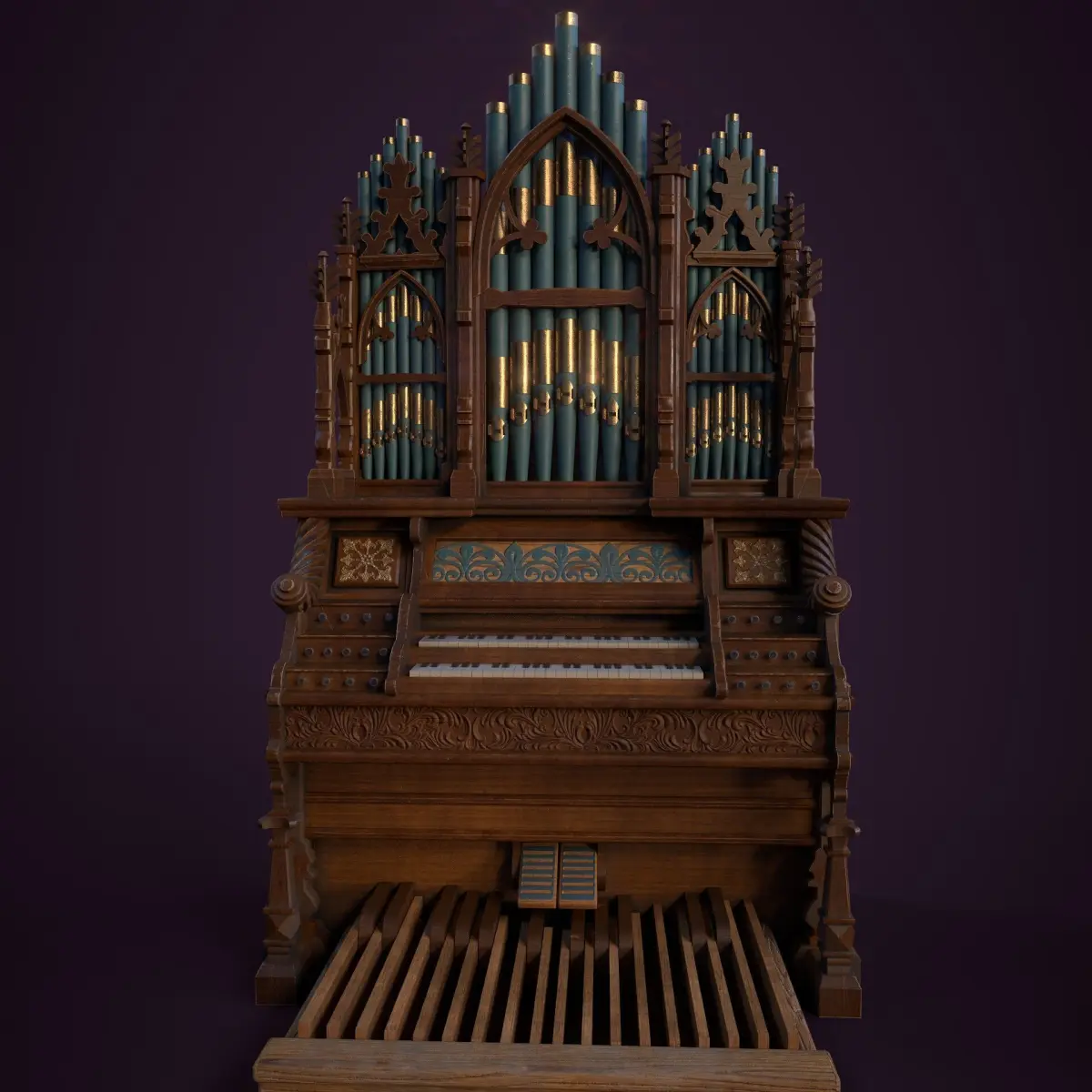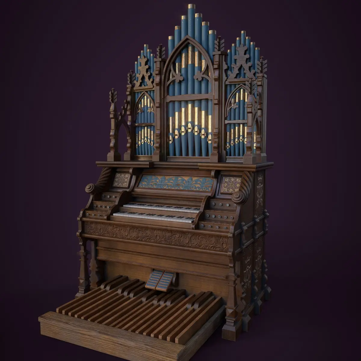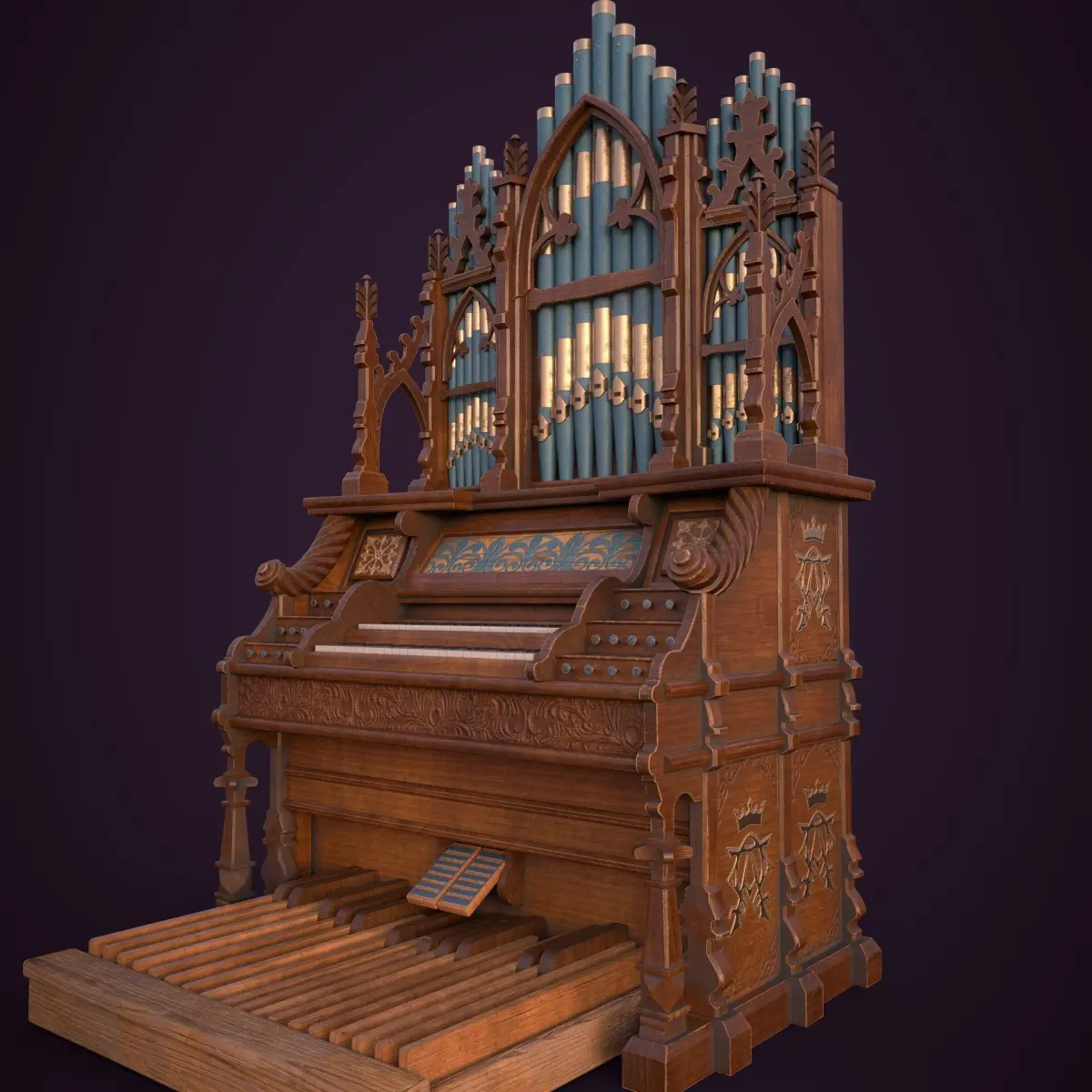 Gothic Pipe Organ 3D Model — a beautifully detailed instrument designed for fantasy or historical settings. Crafted from richly carved wood, this organ features gold-trimmed blue pipes, ornate floral engravings, and gothic arches that give it a cathedral-like presence. From the elegant pedal board to the royal motifs etched into the panels, every part tells a story. A perfect piece for castles, haunted halls, or magical worlds. Has a polycount of 23356 faces, 46516 triangles. Can be used for cinermatics oras hero asset in game engines.Contains 2 sets of textures, pbr and unreal engine packed. Available in 4k and 8k resolution.