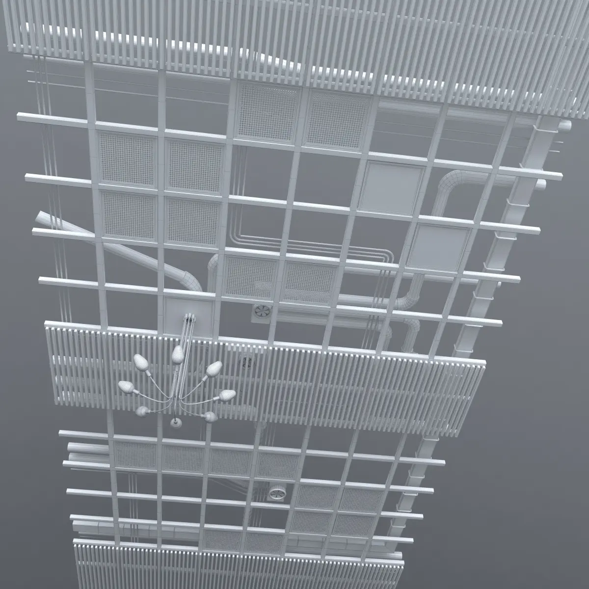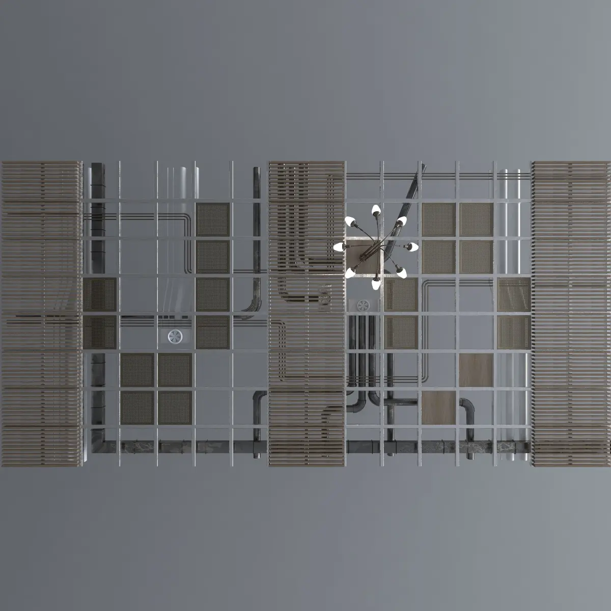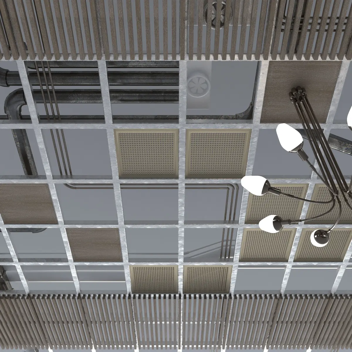Pipes industrial ceiling with wooden sucpended ceiling, chandelier and vents