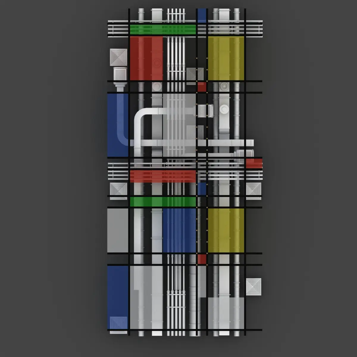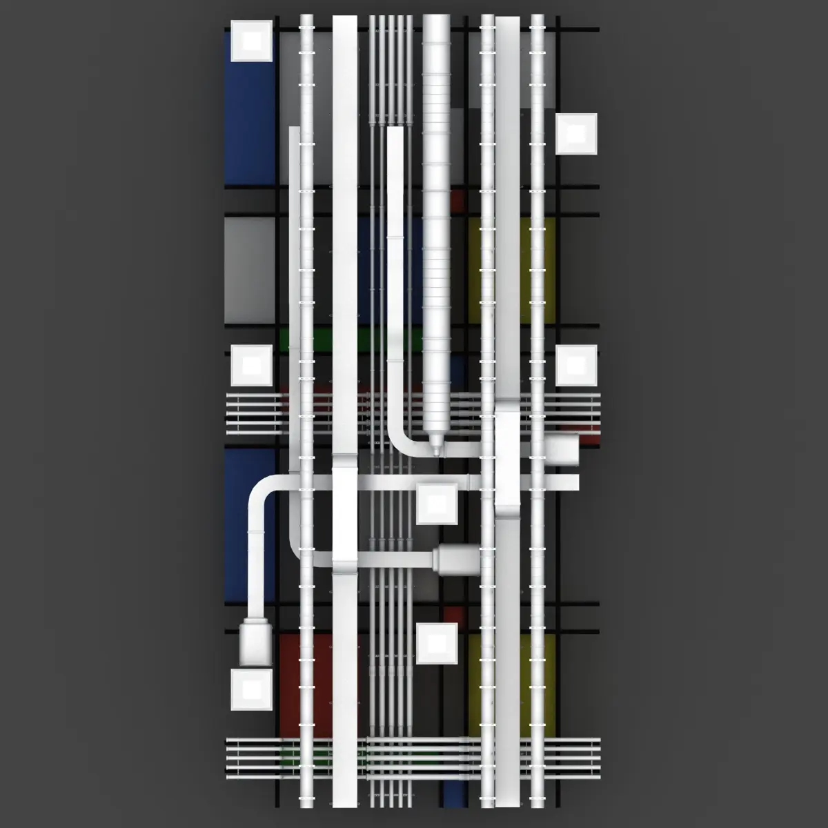 Pipes industrial ceilingwith colored plexy pannels Modrian style