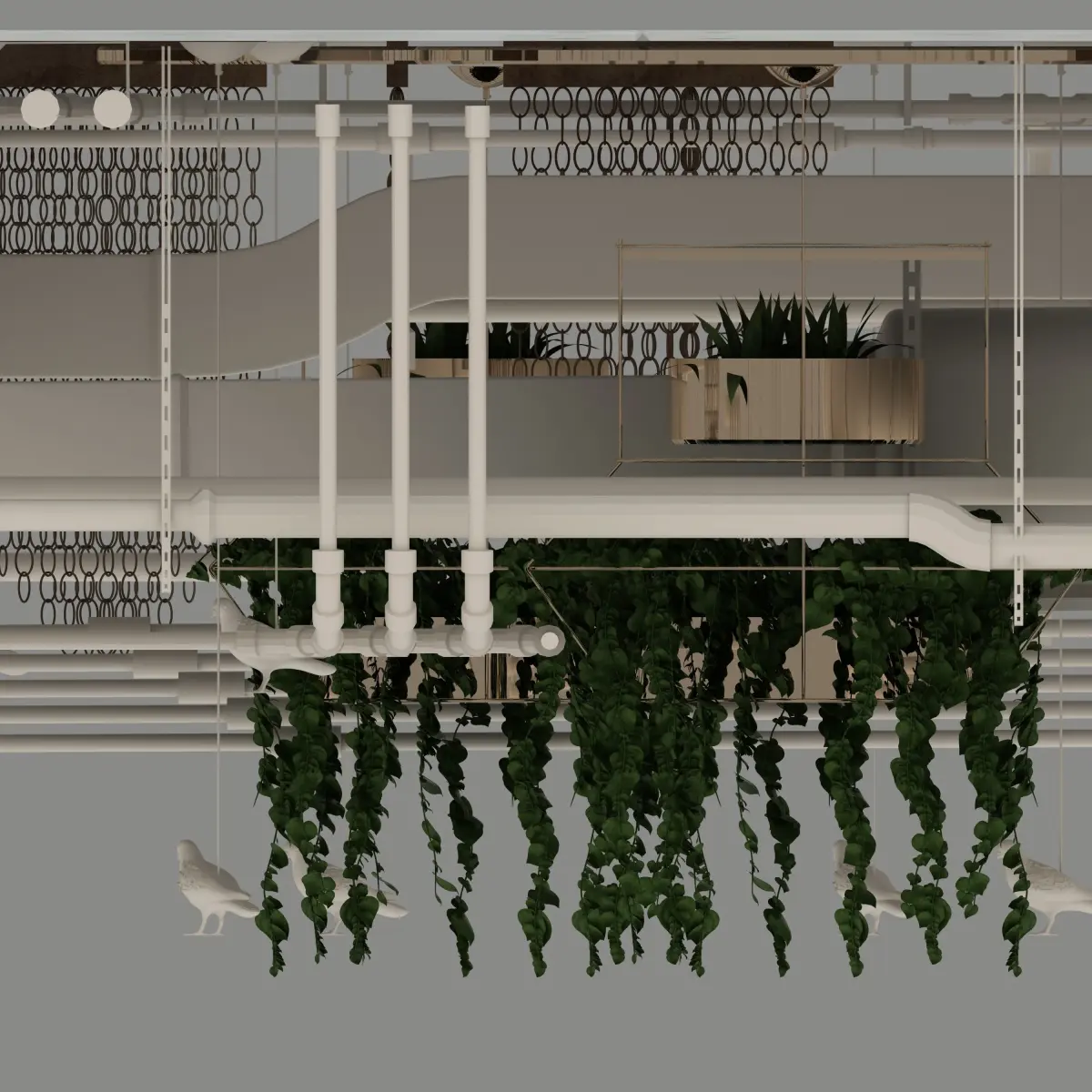 Pipes industrial ceiling with plants chandelier and decorative aditions like bitds, chains etc