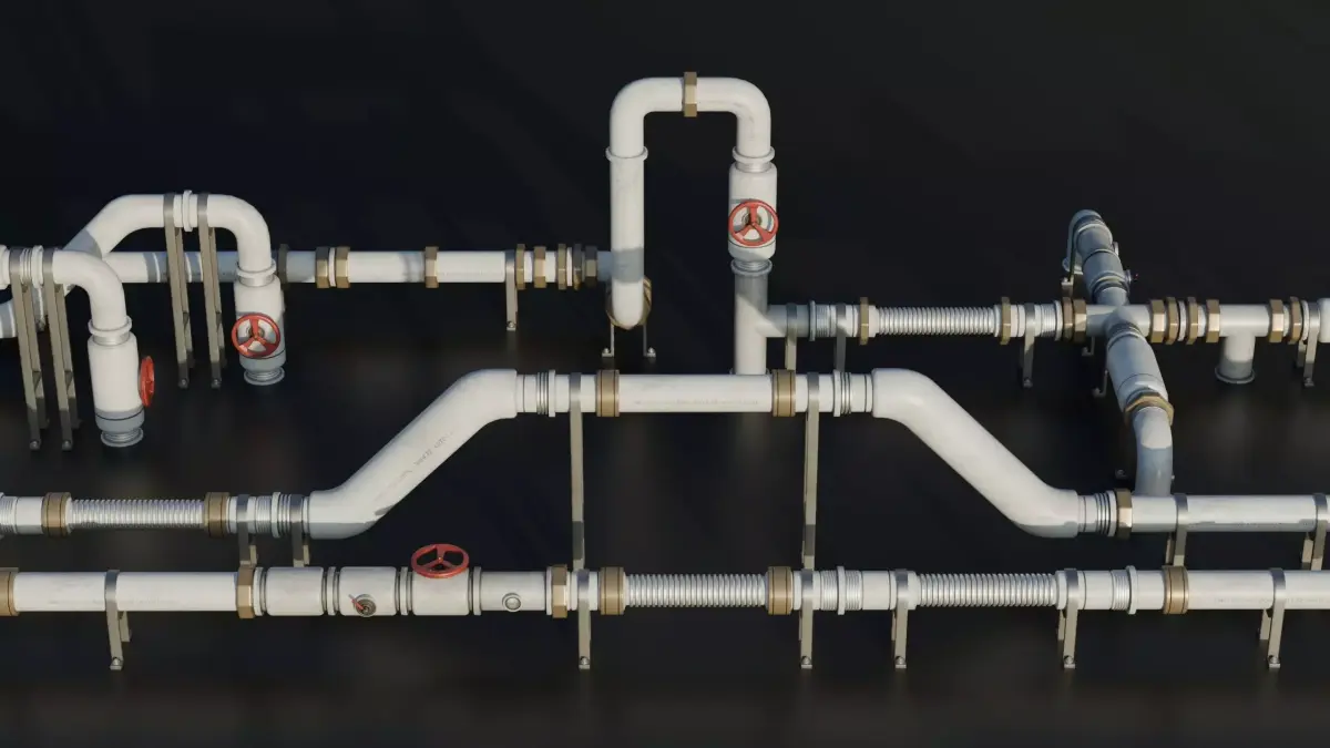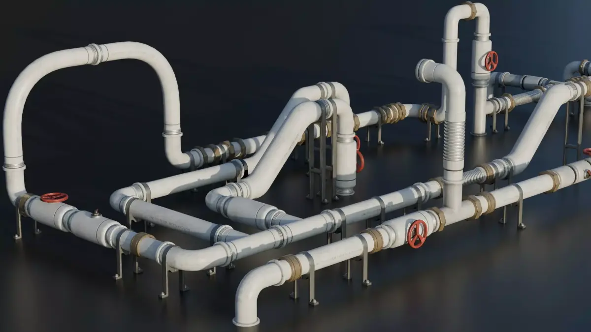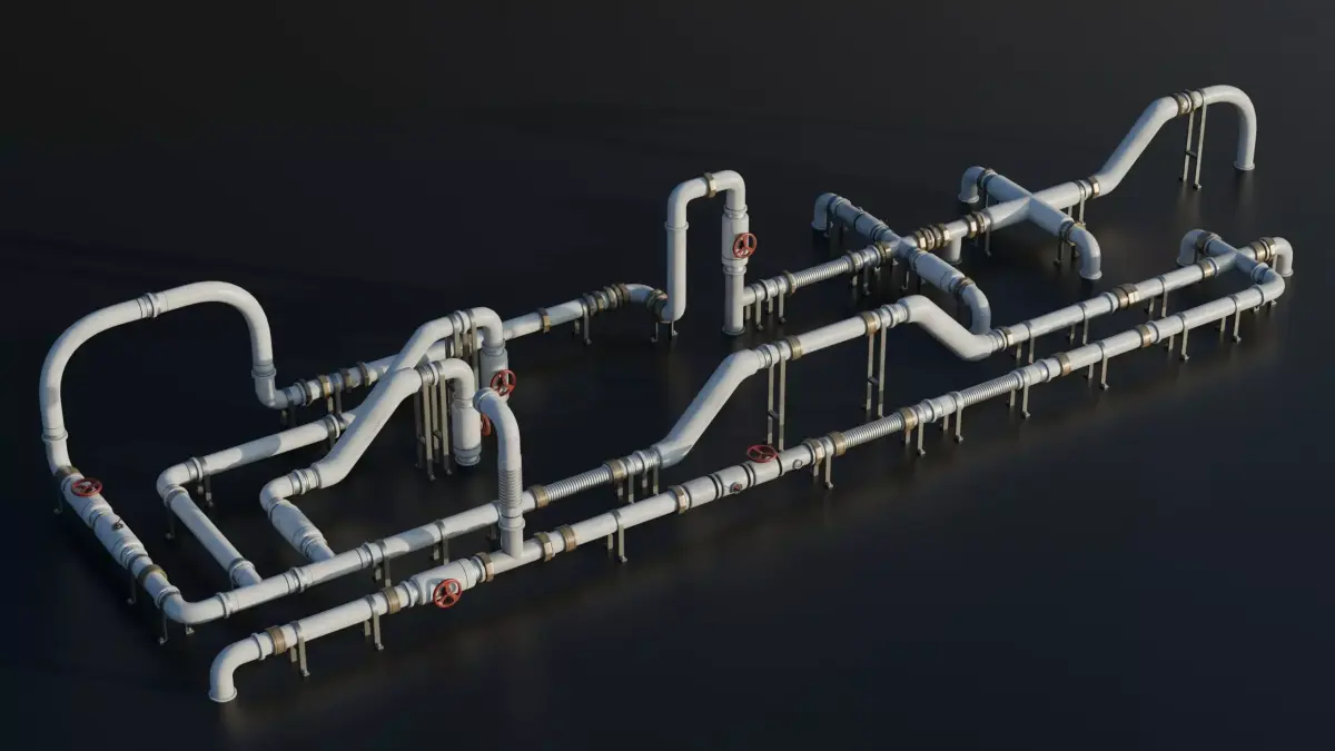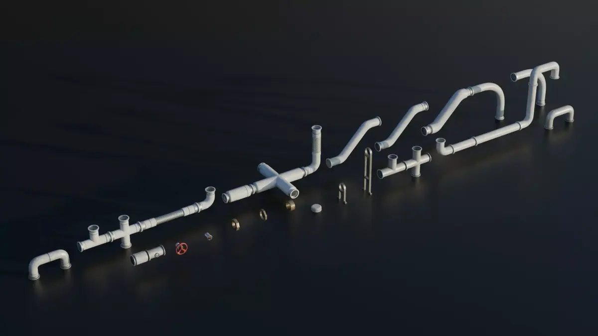 This 3D model represents a industrial pipes modular system featuring fast snapping modular pipes in a 60x60cm grid. Designed for realistic industrial environments, it is fully optimized for real-time use with baked PBR textures and efficient geometry, ideal for games, visualization, and industrial scene design. (Fictional Design) Part of the Roof Elements Pack.