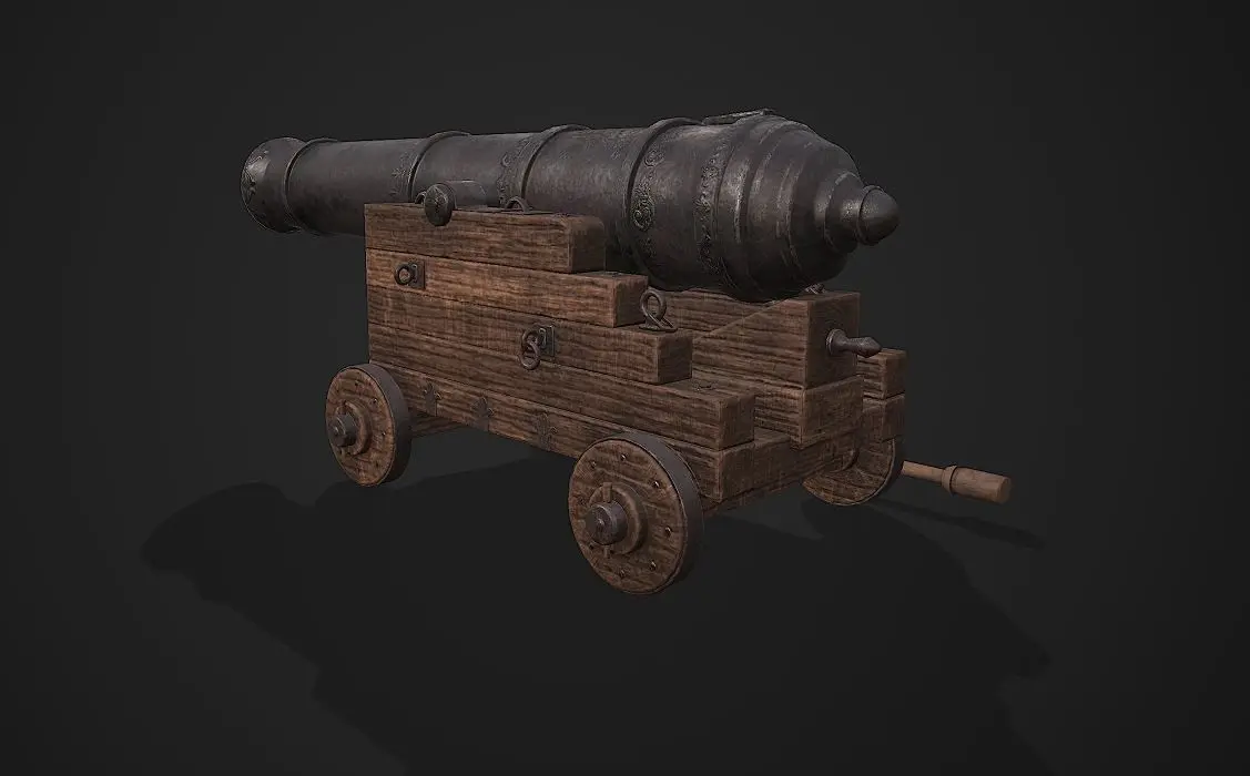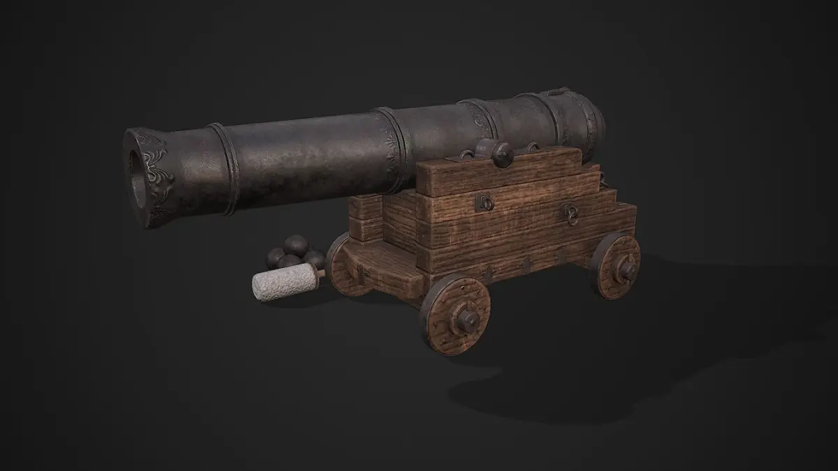 3d model of a pirate cannon with the cannonballs and a bucket. The model is optimized for any game engines.