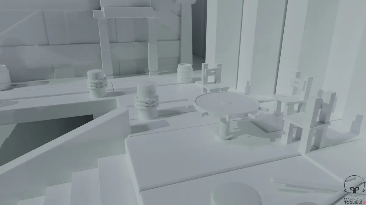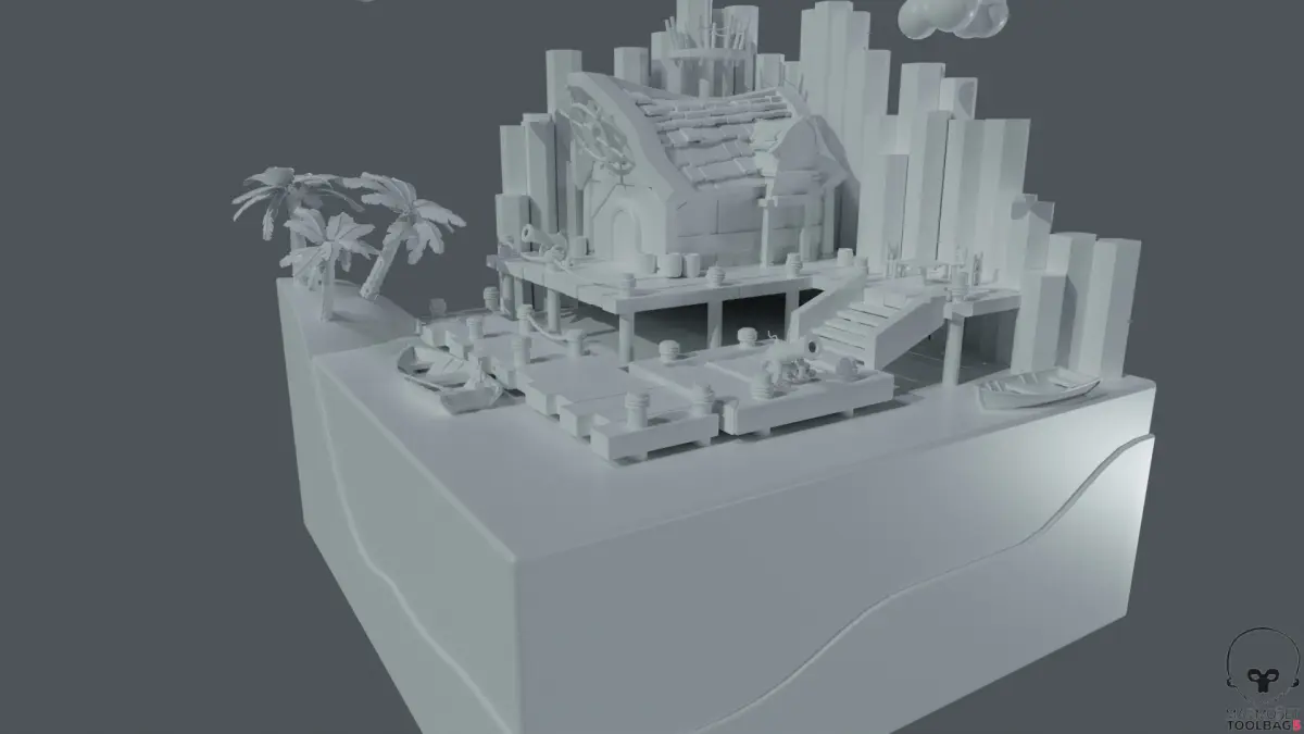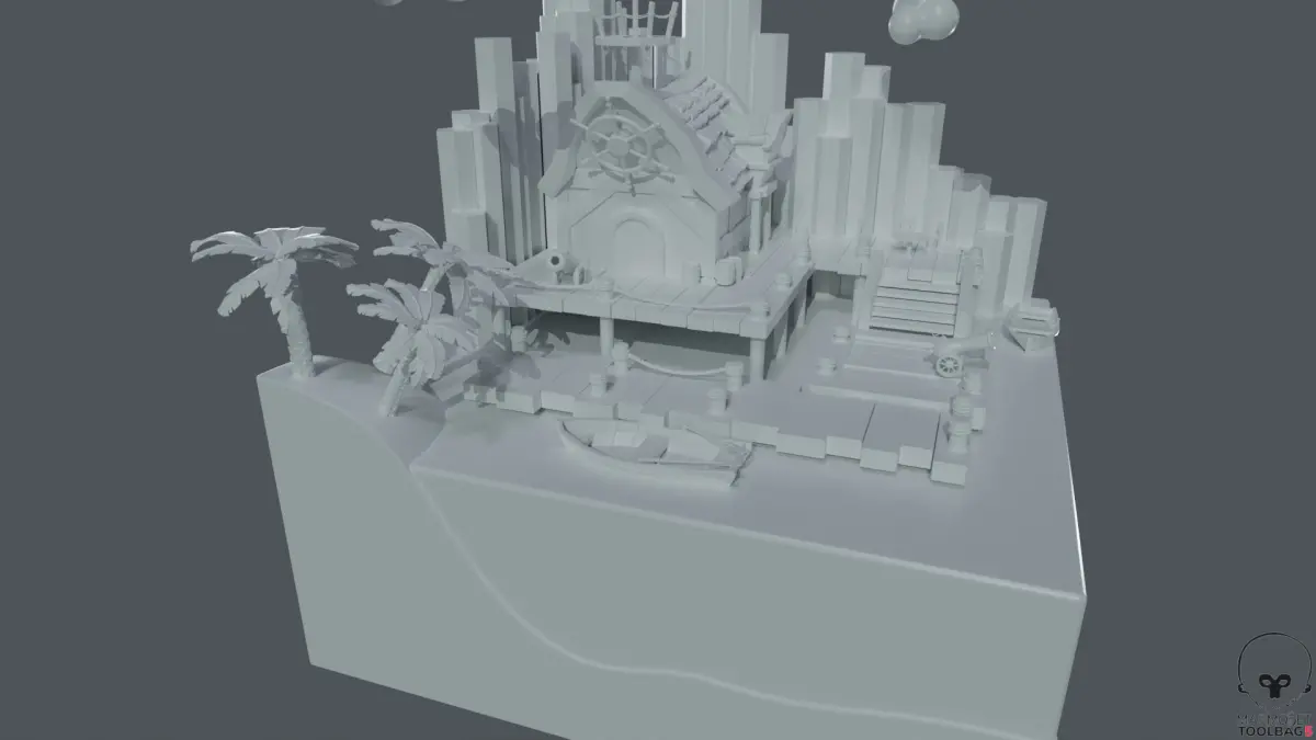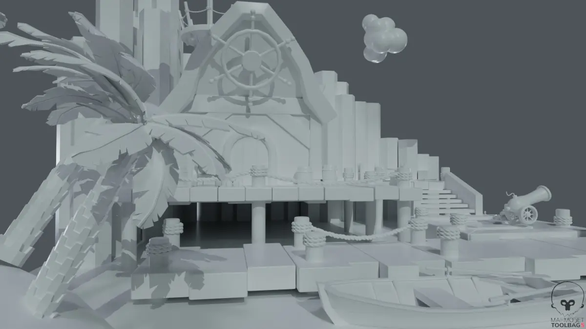 A scene based on a pirate theme with associates props in a low poly stylized style. The assets can be utilized in other porjects as well.