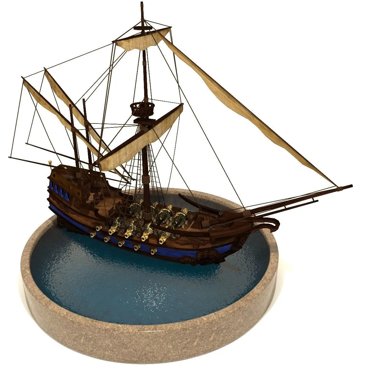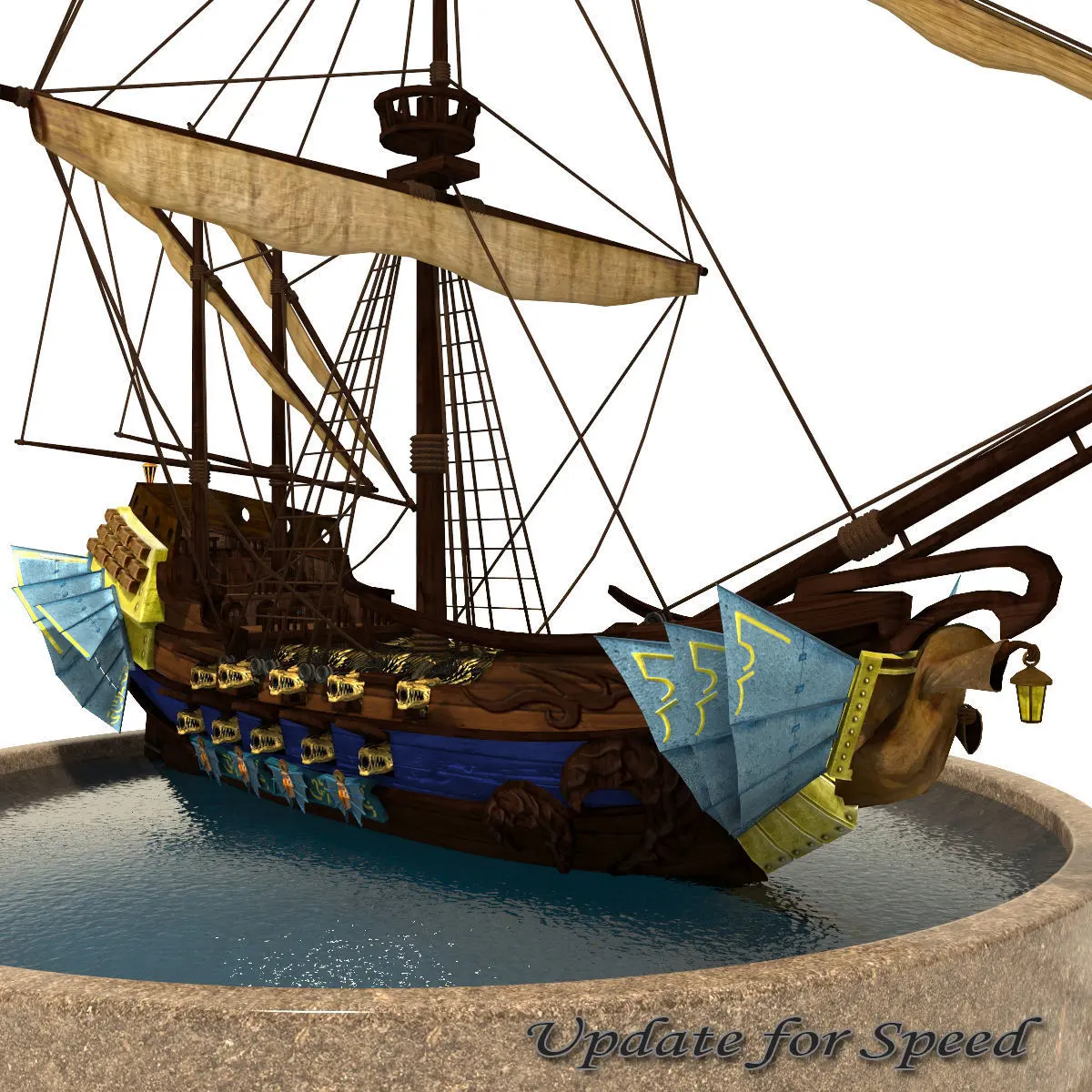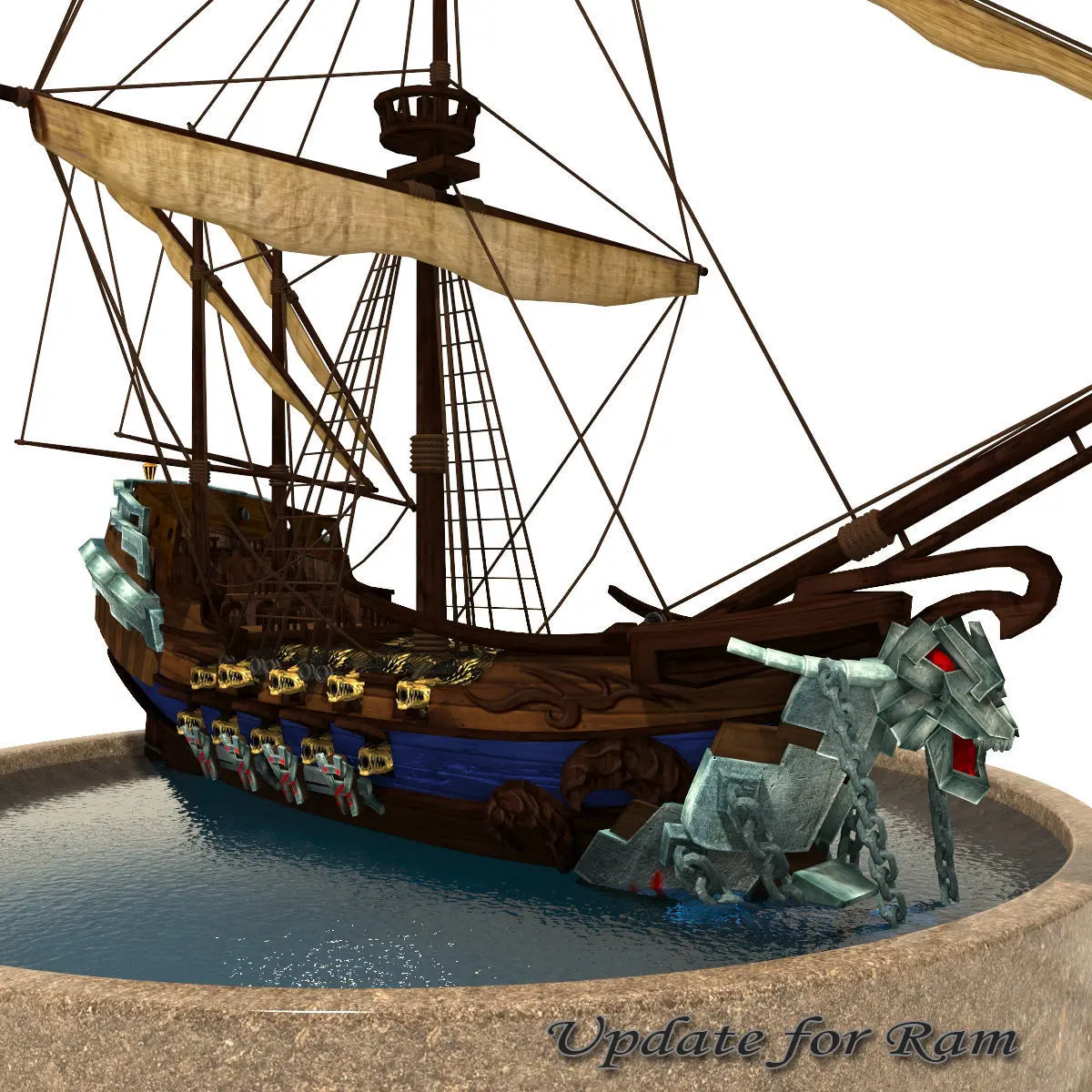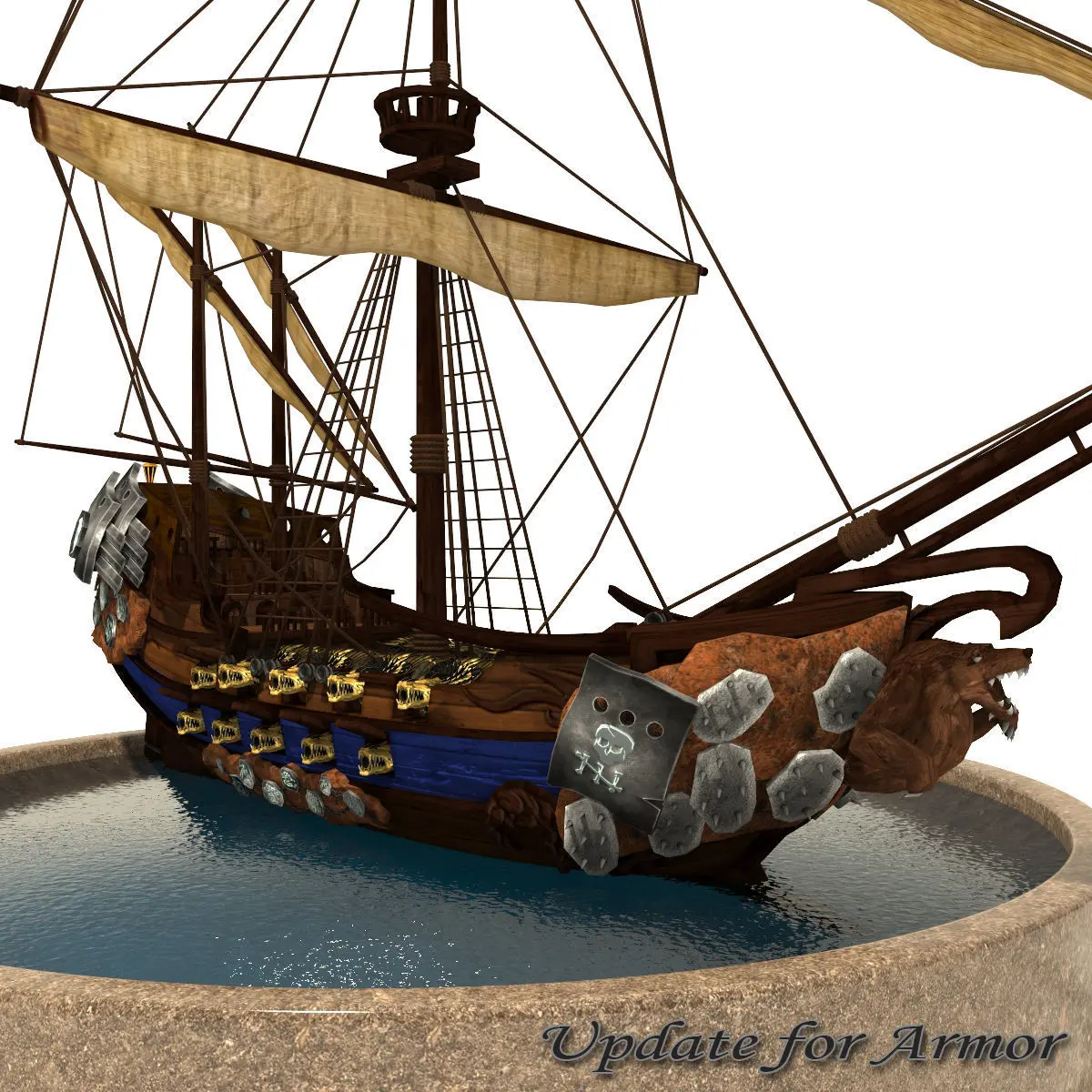 Pirate galleon modeled in a fantasy style. Three upgrades for armor, speed and ram.Ready for using in games. Textures are in .png file format in 1024px. Model is in .fbx, .obj, .max file formats. 2 animated sails set. Rendered with V-ray 3. Contains light, camera and hdri environment map.