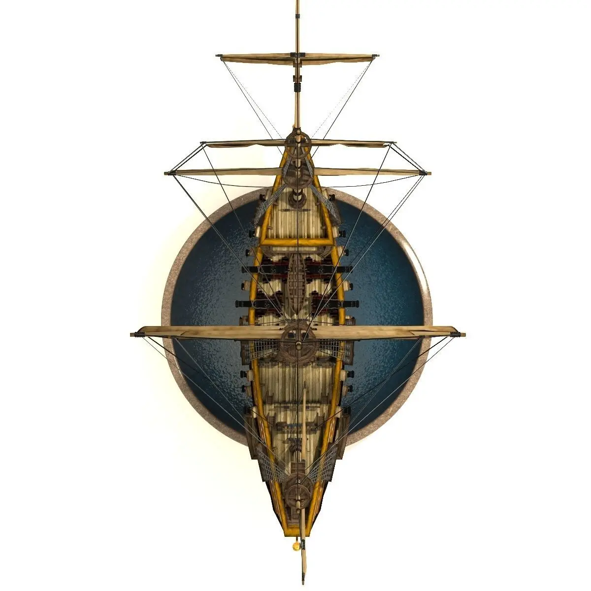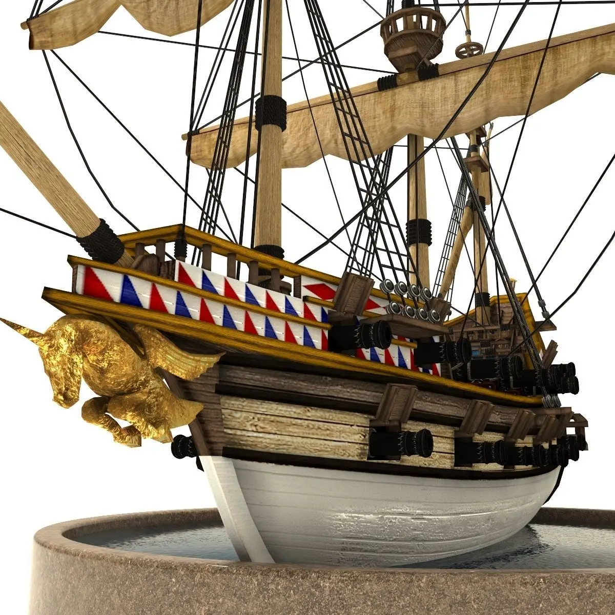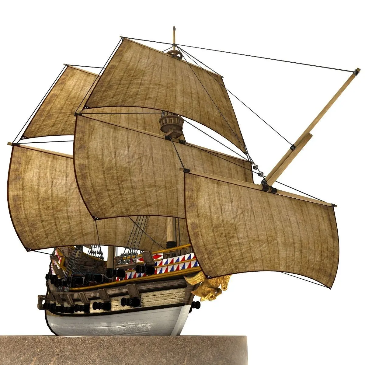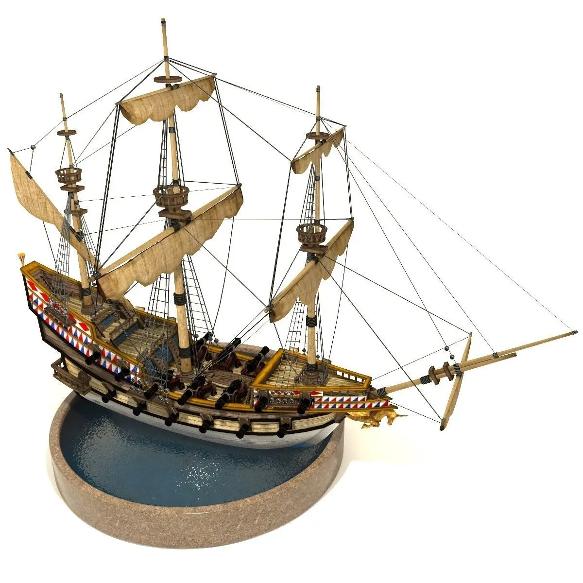 Pirate galleon modeled in a fantasy style.Ready for using in games, movies etc. . Textures are in .png file format in 1024px. Model is in .fbx, .obj, .max file formats. 2 animated sails set. Rendered with V-ray 3. Contains camera and hdri environment map.