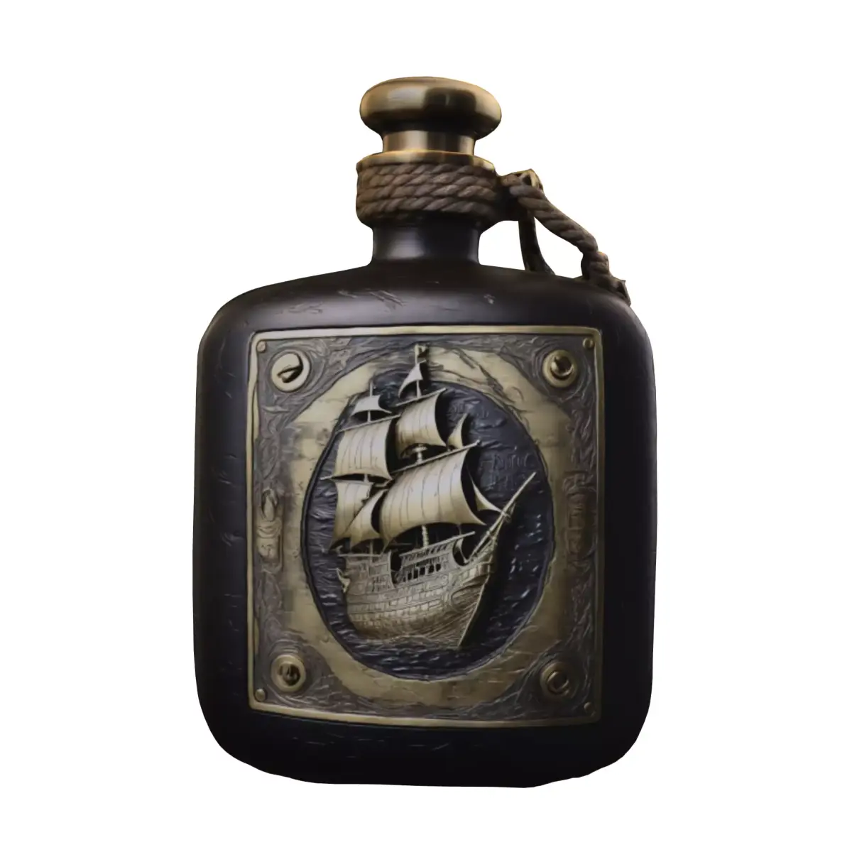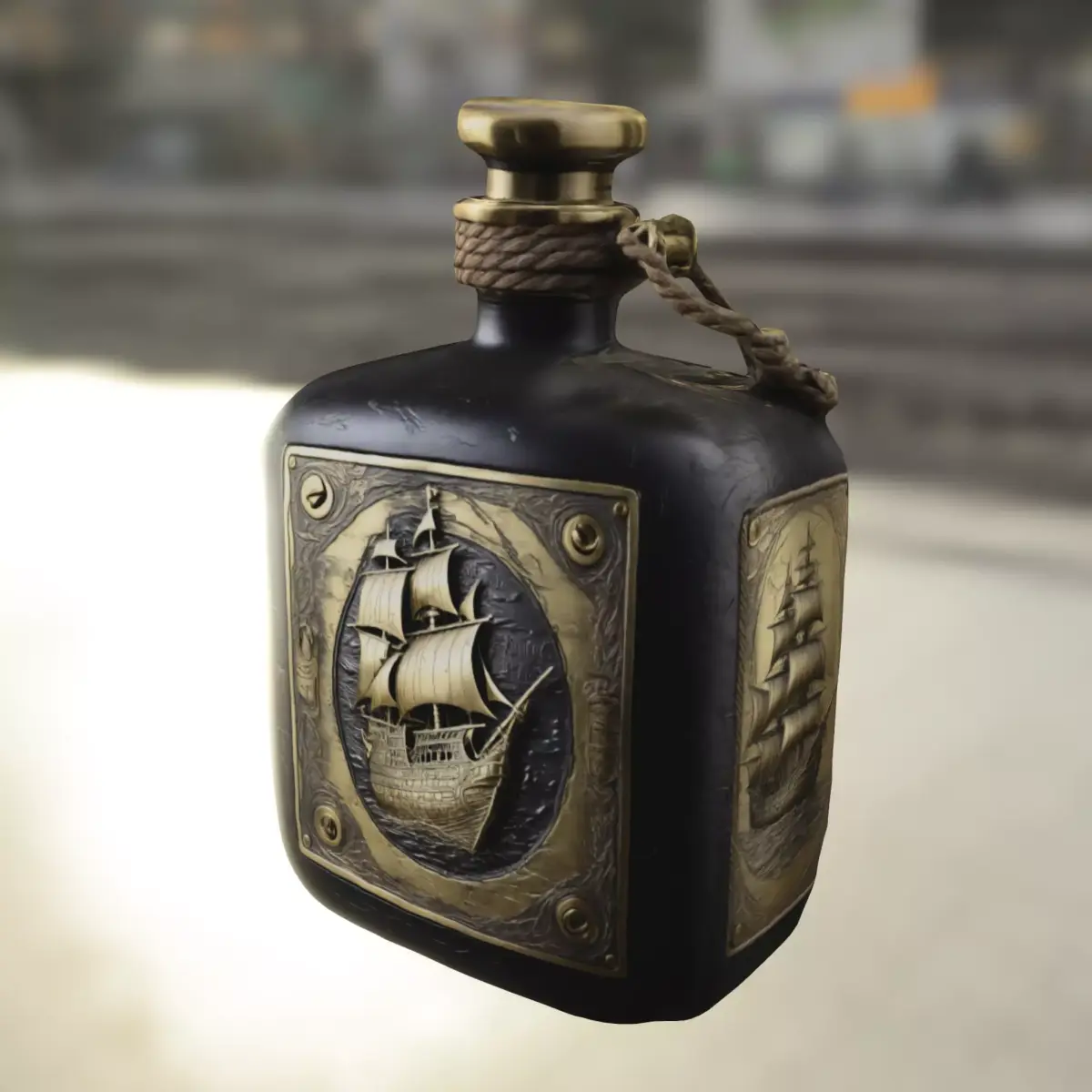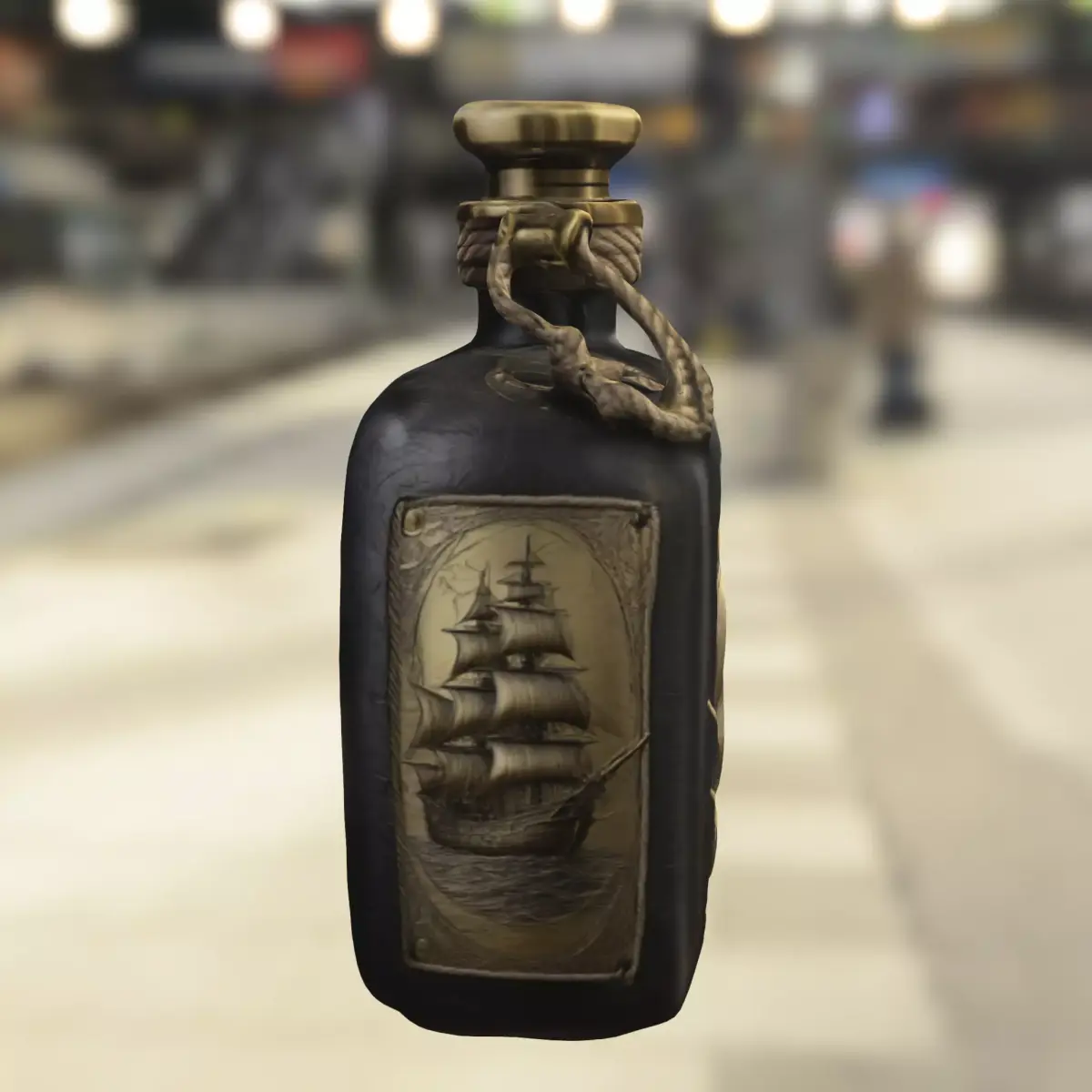 Highly detailed 3D model of a pirate-style flask featuring a carved sailing ship emblem framed in aged brass with rope detail on the neck. Perfect for use as a collectible item, prop, or decorative object in pirate, fantasy, and adventure-themed games such as Sea of Thieves, Assassin’s Creed IV: Black Flag, Skyrim, Roblox, Fortnite Creative, VRChat, Unity, and Unreal Engine. Available in multiple formats (OBJ, FBX, STL, DAE, PLY, GLB, Blender), this model is optimized for digital environments and also prepared for 3D printing, making it suitable as a physical collectible, cosplay prop, or decorative item.