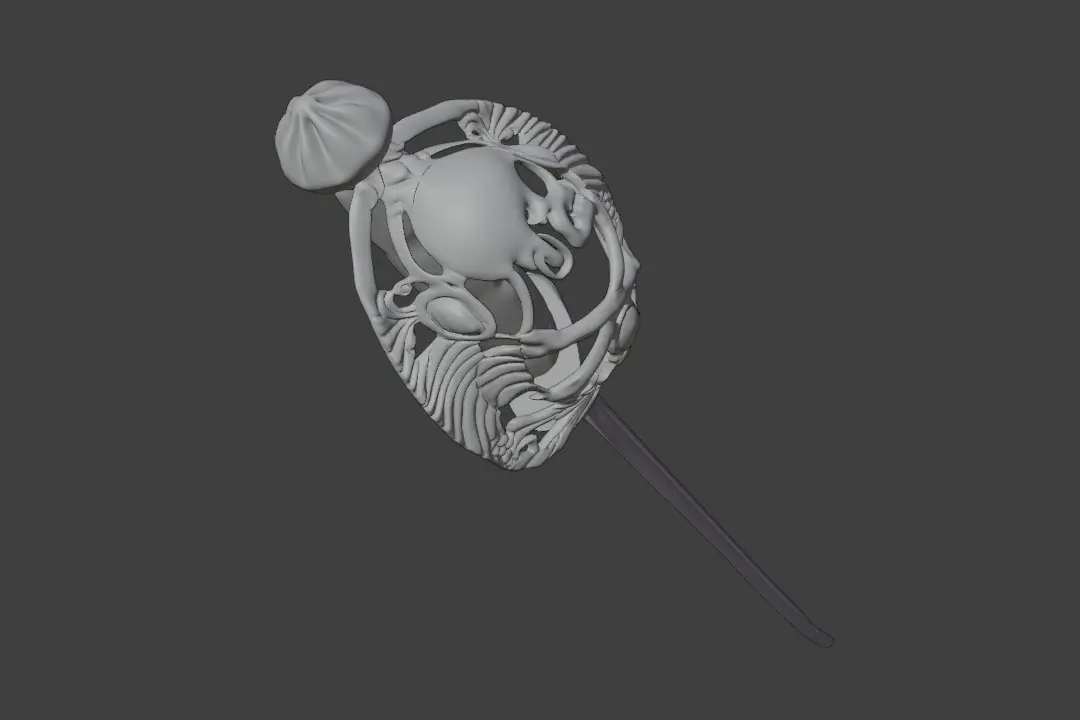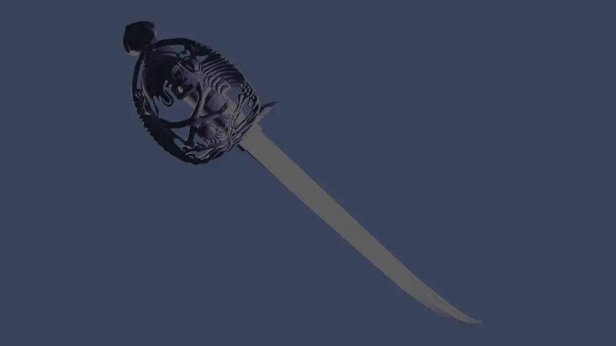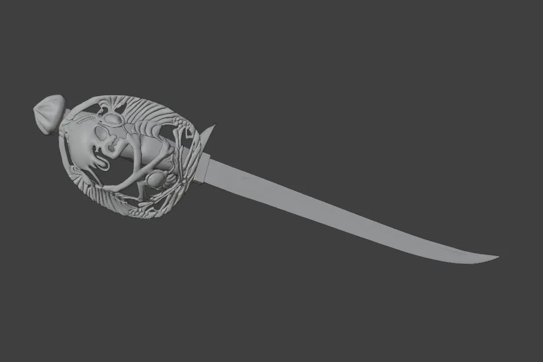 This model is a pirate saber with a handle decorated with a skull and inlaid jewels.