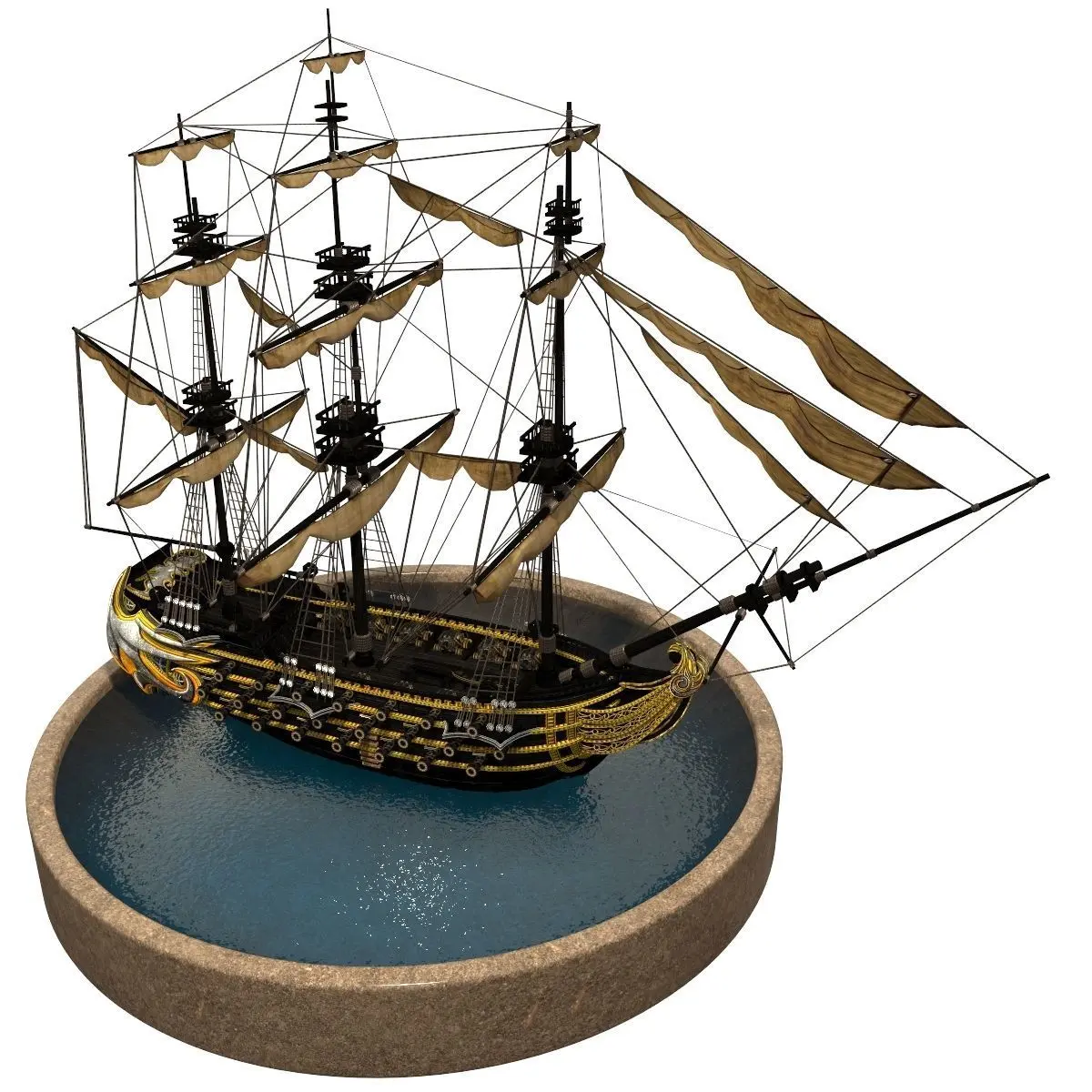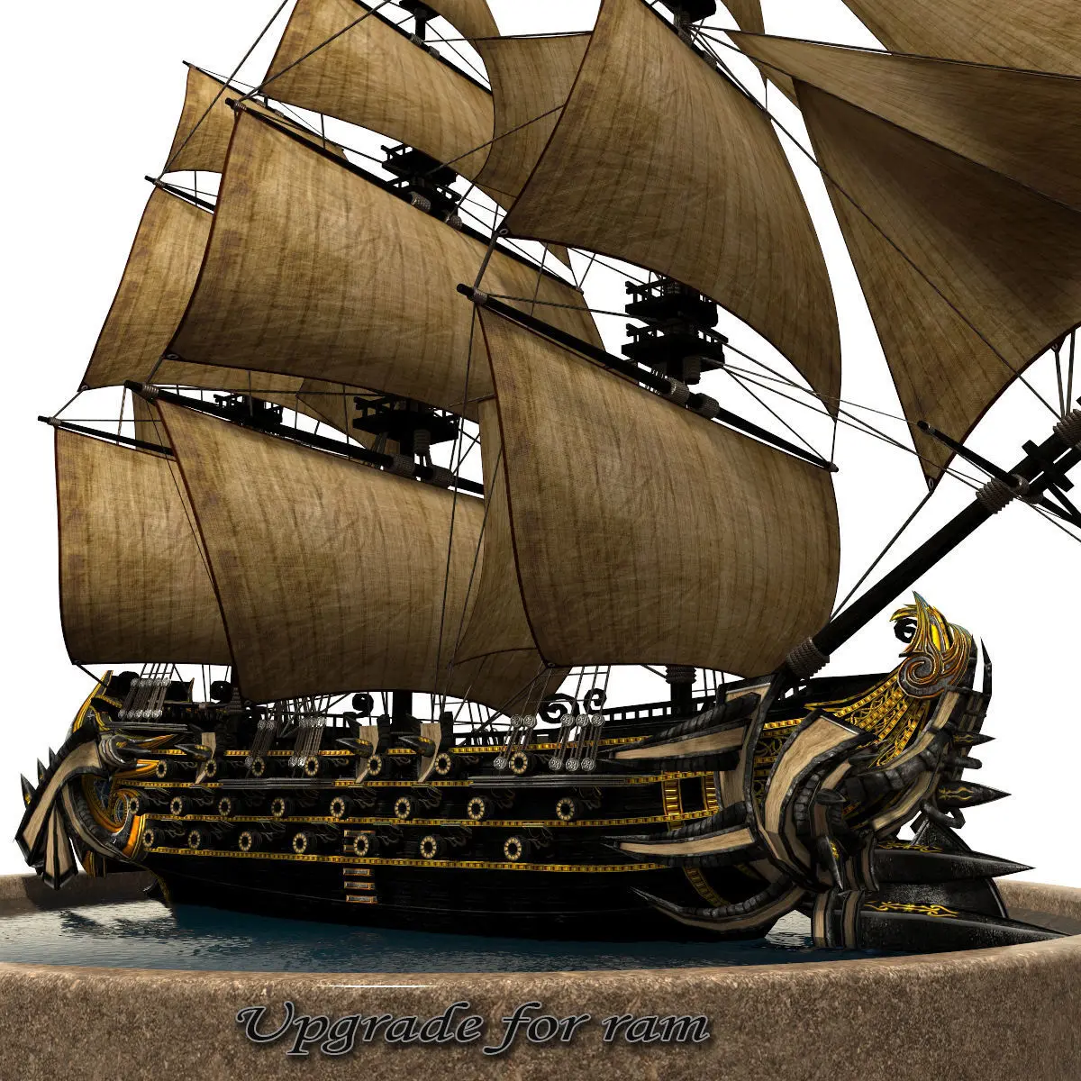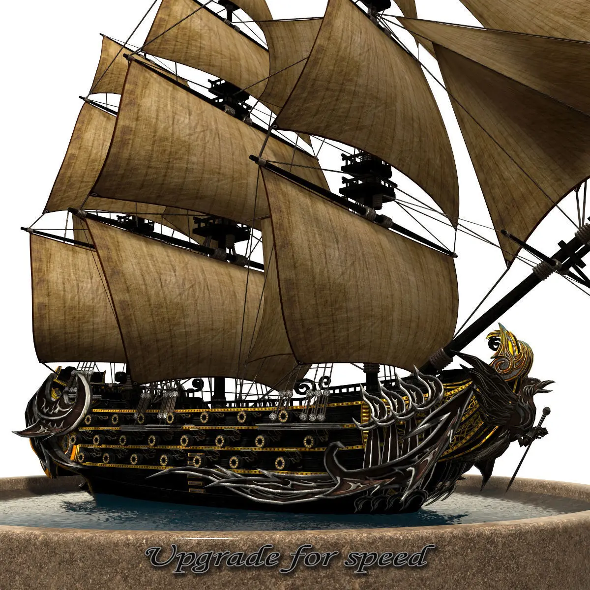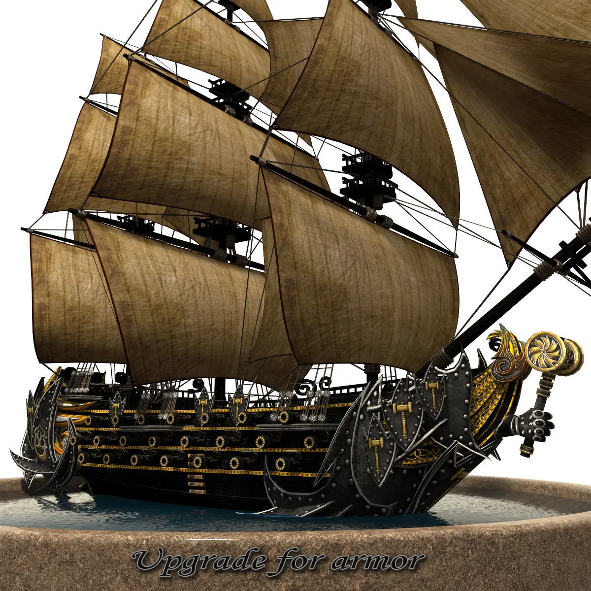 Three-deck linear battleship modeled in a pirate fantasy style. Three upgrades for armor, speed and ram.Ready for using in games. Textures are in .png file format in 1024px. Model is in .fbx, .obj, .max file formats. 2 animated sails set. Rendered with V-ray 3. Contains light, camera and hdri environment map.