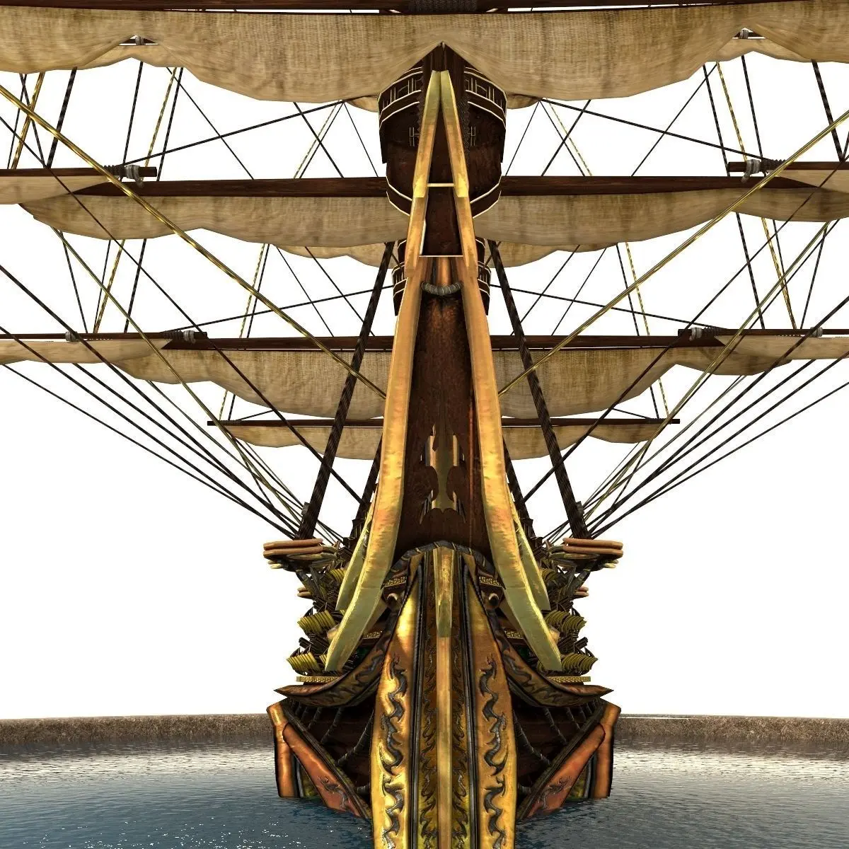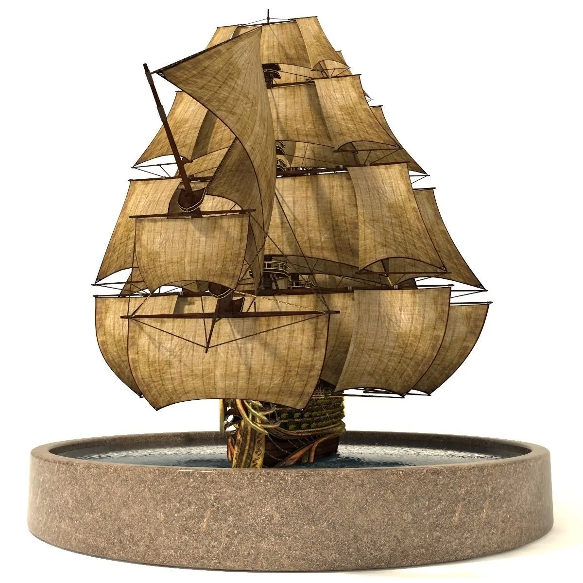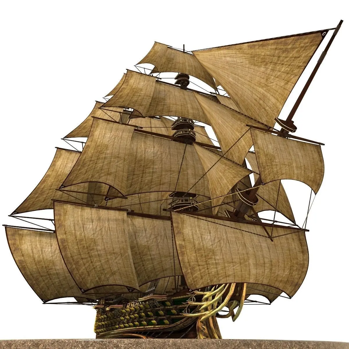 Three-deck linear galleon modeled in a pirate fantasy style.Ready for using in games, movies etc. All objects are placed at center of the scene. Textures are in .png and .tga file format in 1024px. Model is in .fbx, .obj, .max file formats. 2 animated sails set. Rendered with V-ray 3. Contains camera and hdri environment map.