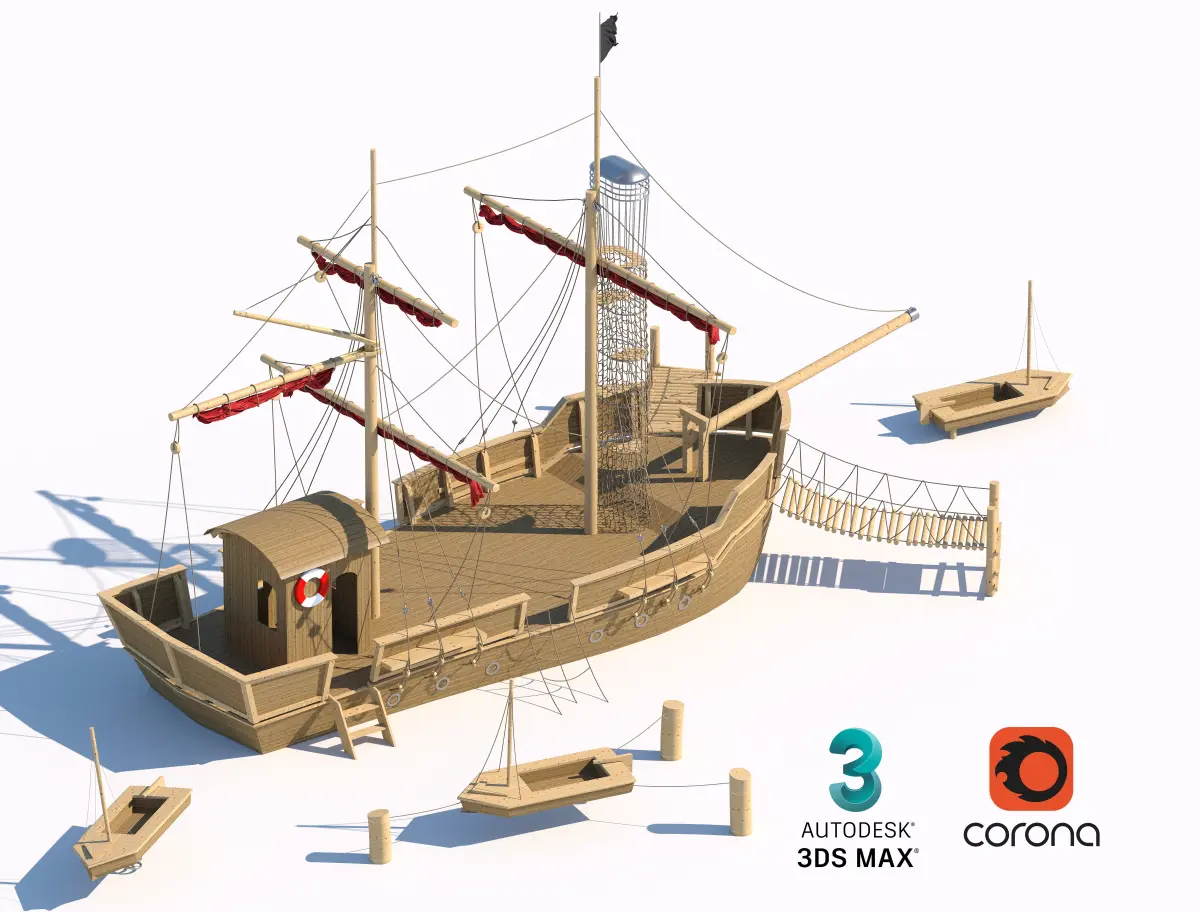 A large wooden pirate ship playground structure designed for outdoor fun and imaginative play. Ideal for parks and recreational areas to engage kids in adventure.