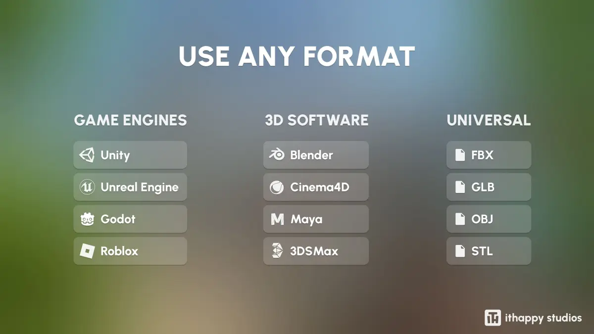 You’ll be able to download formats such as Unity Package, UE, Blender, C4D, Maya, 3DSMax, FBX, OBJ, GLTF, and STL.