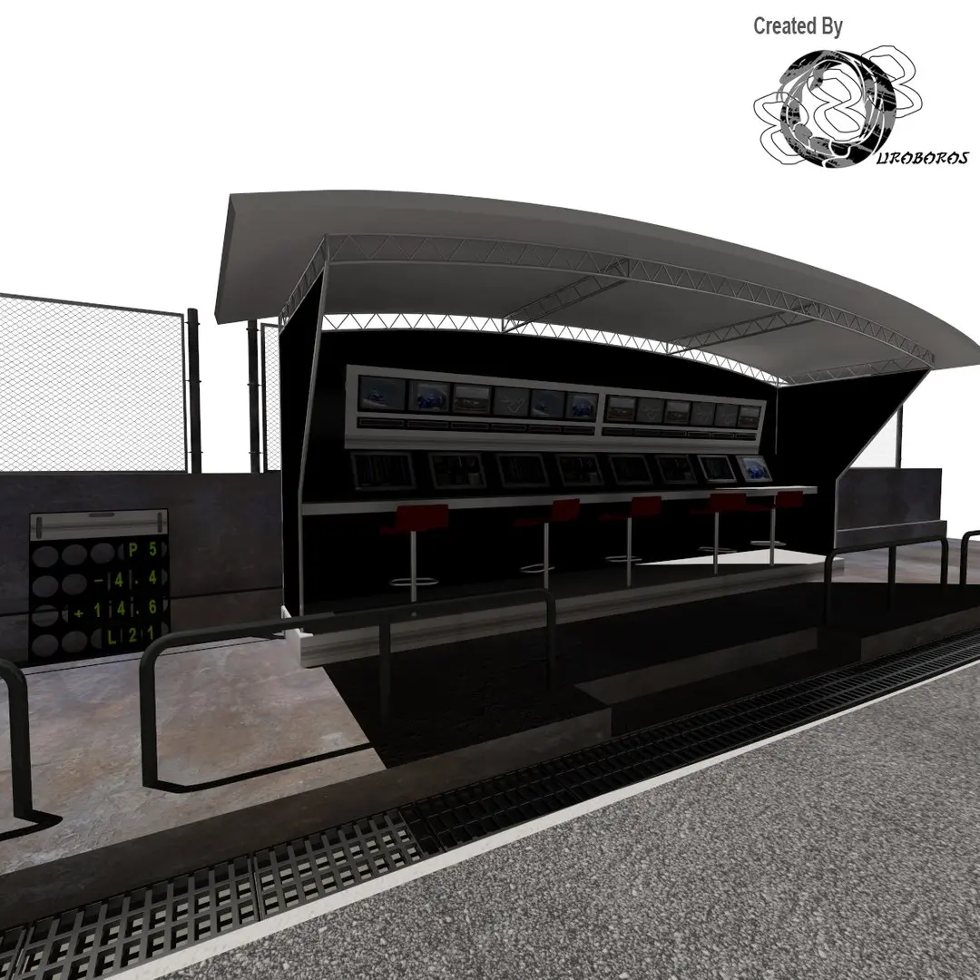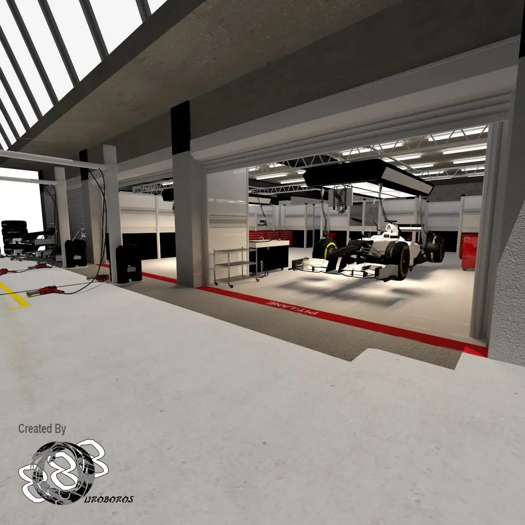A 3d model based on pit garages similar to those used in formula one. includes formula one car and helmets and everything shown in the images.