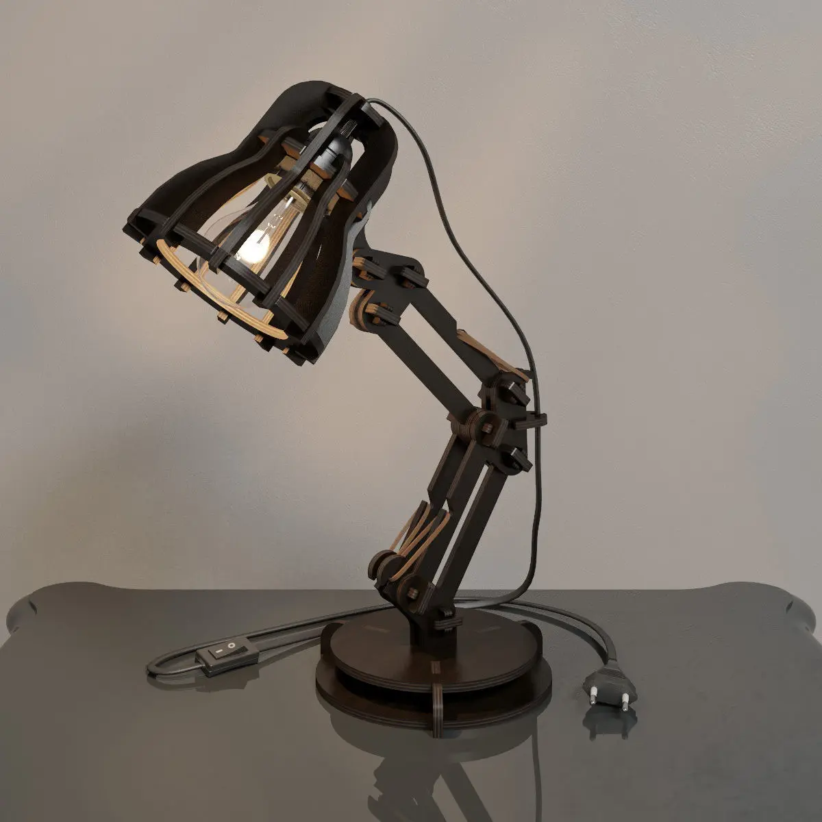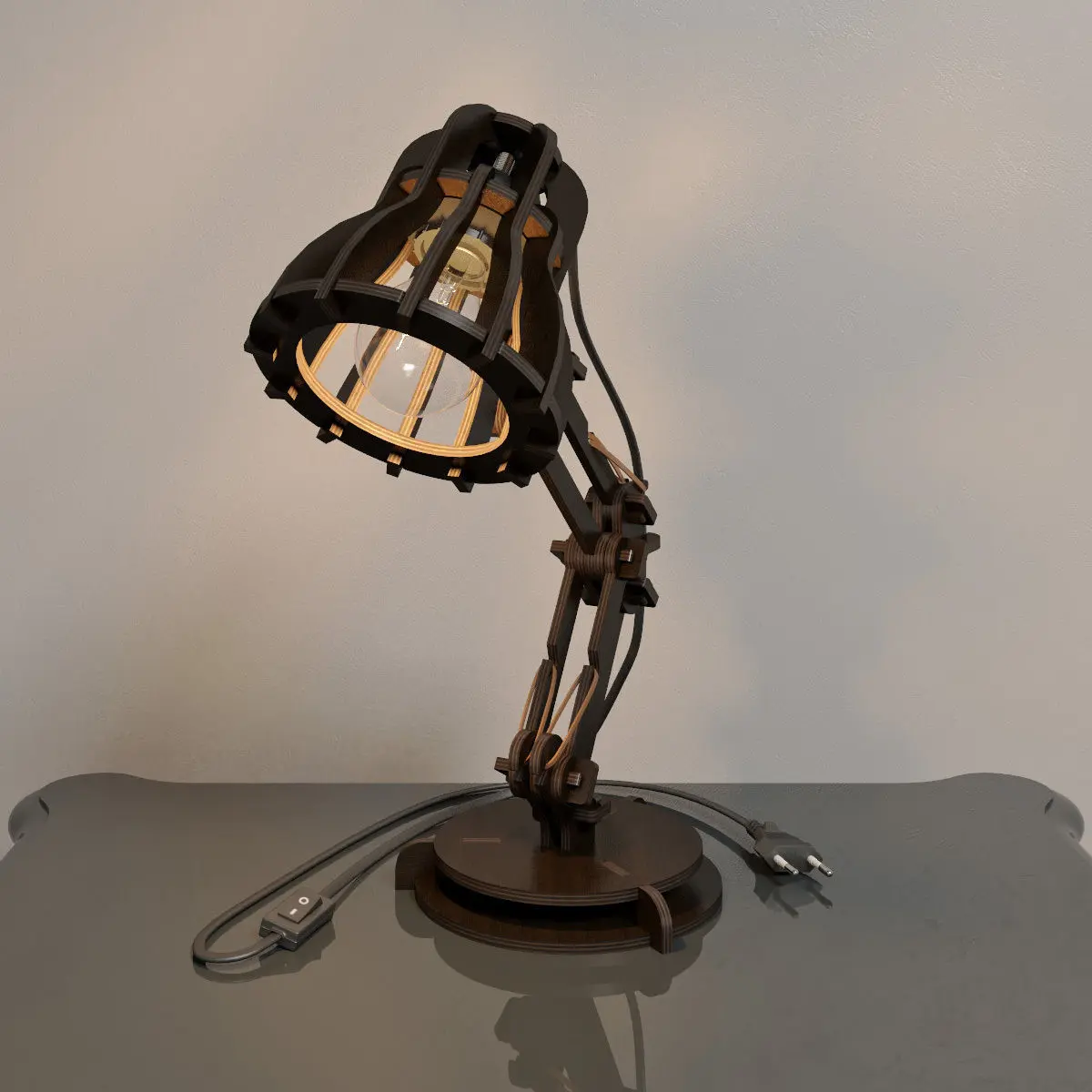 Construction modules based 3d model of desk lamp. Modeled from a photo found on internet. 3d printable (see last foto). DWG drawing of every module is included for customization purpose or CNC (6mm plywood), units = mm. Fitting option is 0.2mm included, so it is a bit tight in assembly.