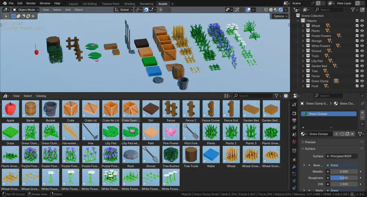 The product files include an asset library file with all 51 assets pre-setup in the asset browser with custom thumbnails. Setup the asset library in Blender and you can drag and drop the 3d assets into your scene.