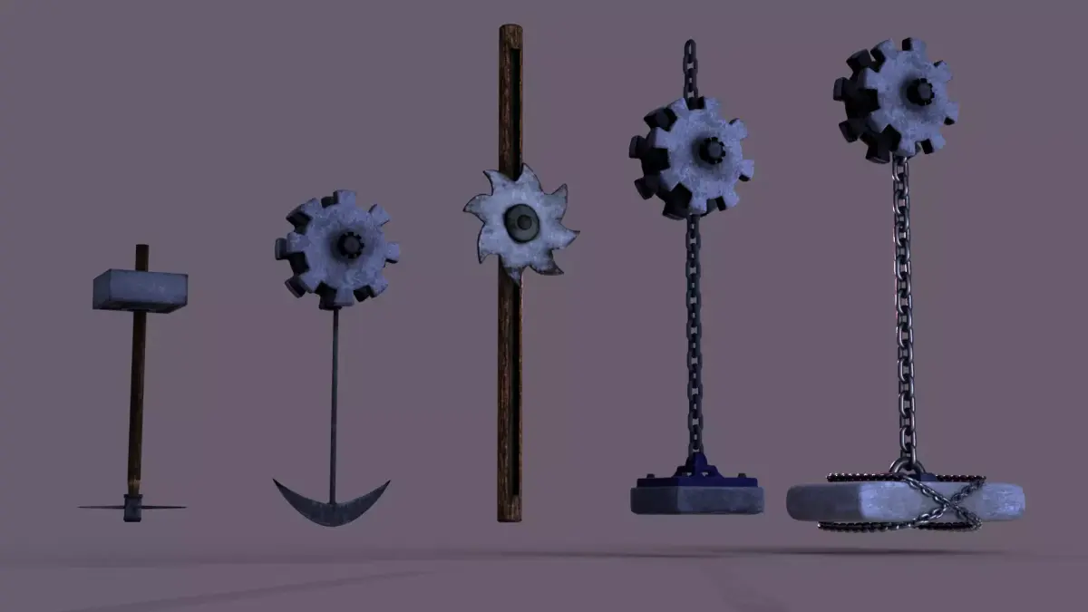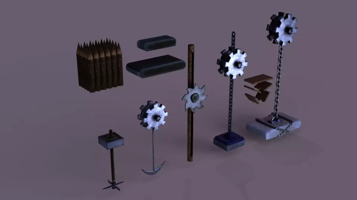 Spike barrier / wooden stakes2 platform pieces (step blocks)Gear + pole mechanismChain gear trap (standing)Chain gear trap with base + chain wrapPendulum/anchor hazard (gear + chain)Wood debris / planks