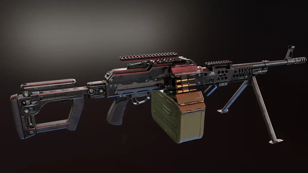 Classic PKP Pecheneg with few additional parts by Zenitco: PT-2 Telescopic Stock, B-50 Handguard, RK-2L Front Grip, RK-3P Grip and B-51 Top Rail.