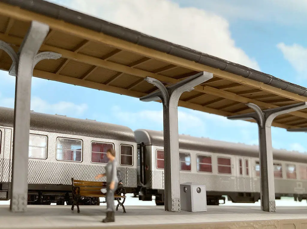 Set of 20 items to create platform installation. The design is modular, which means both platform length, roof length and composition can be adapted to your individual need. The platform is early 1900s design with riveted pillars and wooden roof. Both sitting and standing passengers are included. Ready-to-print super detailed items set for H0-scale Model Railroad. The 3D-models with supports for resin print are included and all neccesary preparations are made to simplify print. Simply download, un-zip, slice and print. Enjoy!