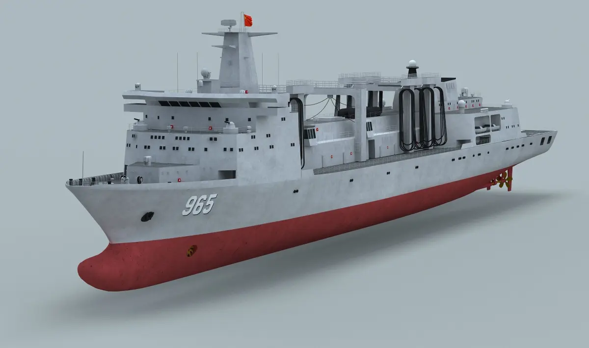 Hulun Nur 965 is a new type of comprehensive supply ship independently developed by China using globally advanced technologies.It is capable of conducting replenishment-at-sea with the aircraft carrier battle group or other ocean-going naval fleet.As the first Type 901-class ship, the Hulunhu has a displacement of around 50,000 tons and was built specifically to accompany aircraft carrier battle groups.