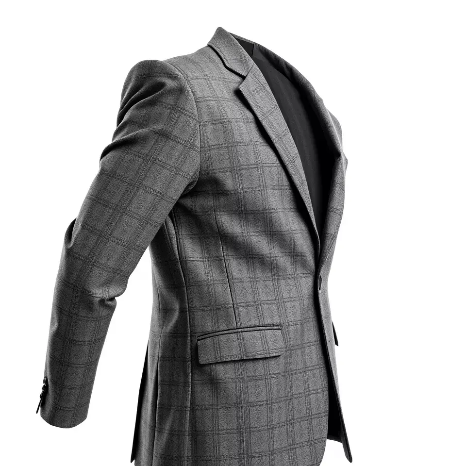 This plaid gray suit jacket model showcases a stylish and professional design, perfect for virtual fashion shows or realistic character development in cinematic scenes. Each model has 3 levels of detail: low-poly (1000 triangles for mobile), middle-poly (10,000 triangles for environment), and high-poly (100,000 triangles), which allows for the use of this model in production rendering (such as 3ds Max, Maya, Cinema 4D, Blender, Vray/Corona/Cycles and all others), game engines (Unity and Unreal compatible), and interactive presentations, providing a choice of detail based on the LOD System principle. This model is ideal for use in fashion simulations, retail visualization, and VR experiences. The model's textures are PBR, Diffuse, NormalMap, and reflection/roughness/metallic, which are suitable for any modern rendering engine. All models are accurately unwrapped and have no overlapping UV. All textures are 4096x4096 in size. If you like this model, please leave a like and comment!