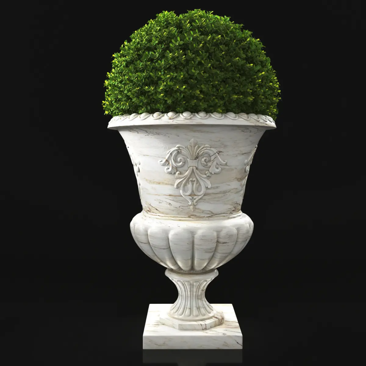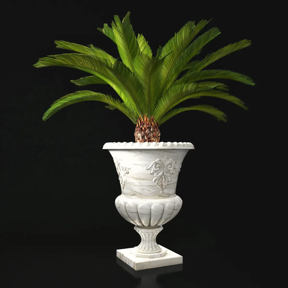 Boxwood and cycas palm in marble antique urn suitable for an exterior area. (garden, terrace, backyard)