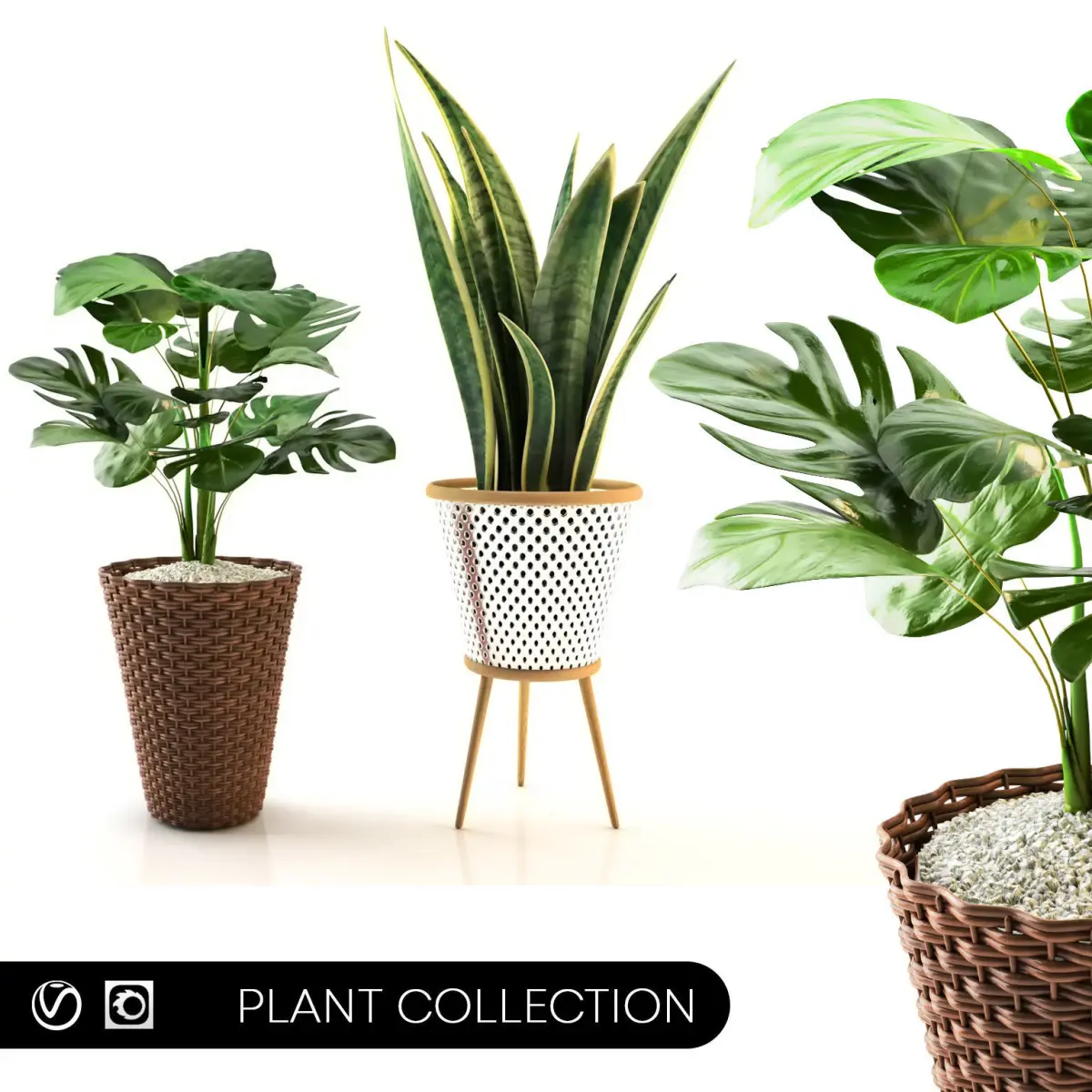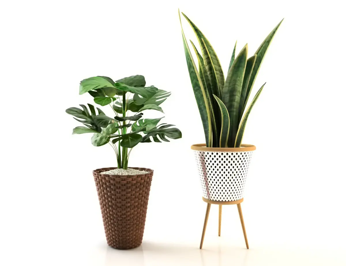 -include two kinds of different plant in a round wicker plant pot suitable for an interior area. (bedroom, kitchen, living room, terrace, cafe, bar, restaurant)