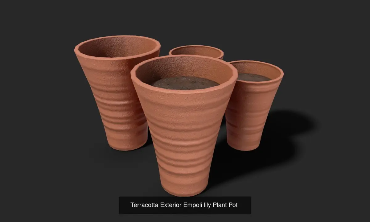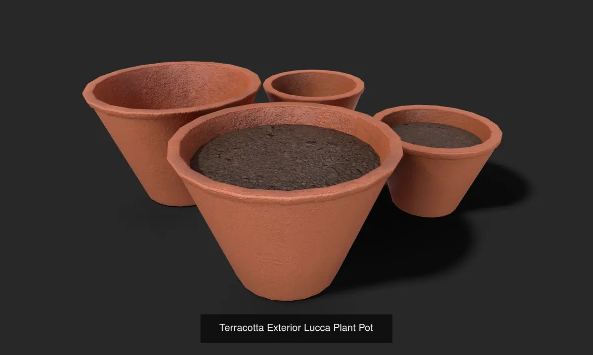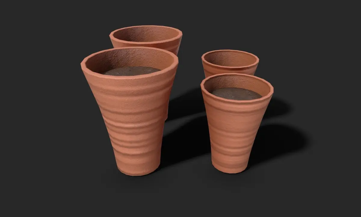 This is a set of plant pots ideal for use in game developement and or animation. it includes 6 empty pots and 6 pots with soil. Each Pot polycount ranges between 600-1200 and have textures up to 2k resolution