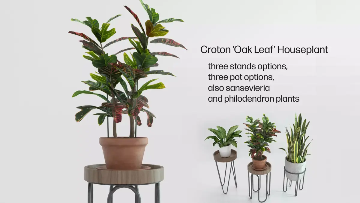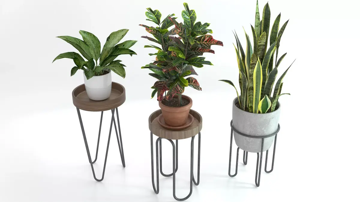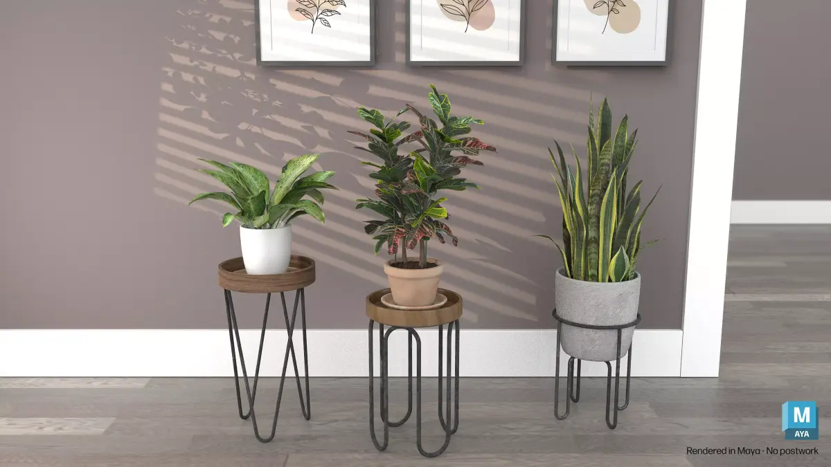Three plant stands with UV textured metal legs and wood accents.Mix and match between the plant stands and plants or use the plant stands with other plants that you have.Comes with Croton Oak Leaf variety Houseplant, Sansevieria aka Snake Plant, and Philodendron. All have high resolution UV texture maps, see previews. Texture images captured from our own plants! HDRI image included, no editing done to renders.