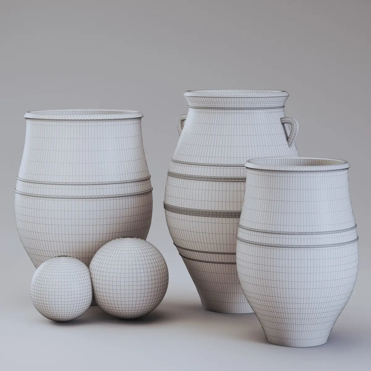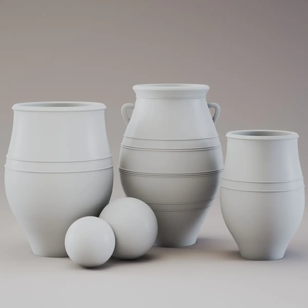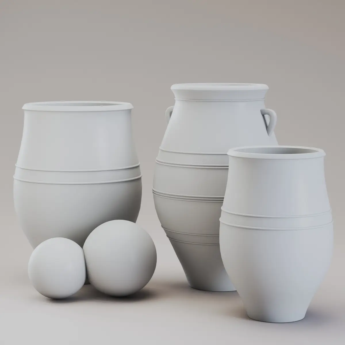 A variation of exterior planter pots, which can be used as a decorative element in a garden landscape or cn be used as the base for some shirt trees/shrubs