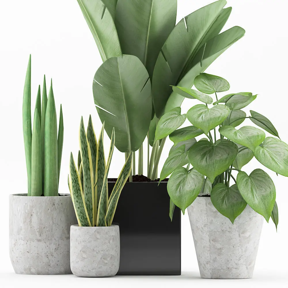 Plants 58.Palm, sansevieria, sansevieria cylindrical, philodendron and banana plant with concrete and black glossy pot.Max 2012 and 2015 with fbx file.