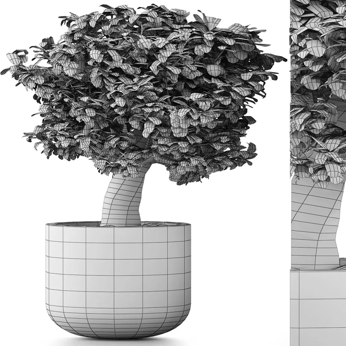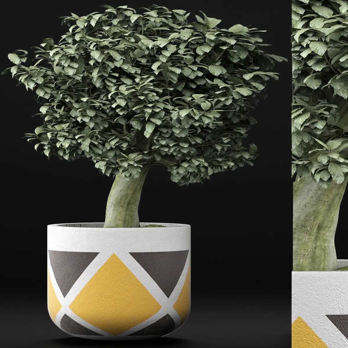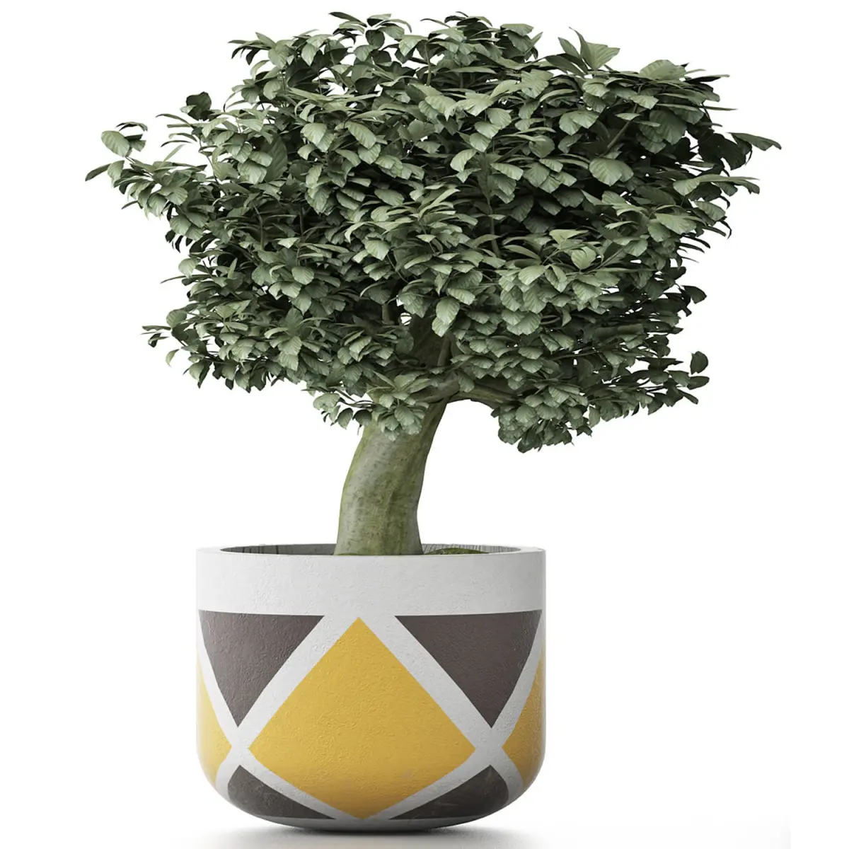Large plant similar to a small bonsai, with a deformed trunk and a colorful flowerpot.