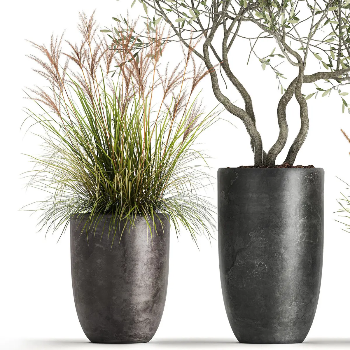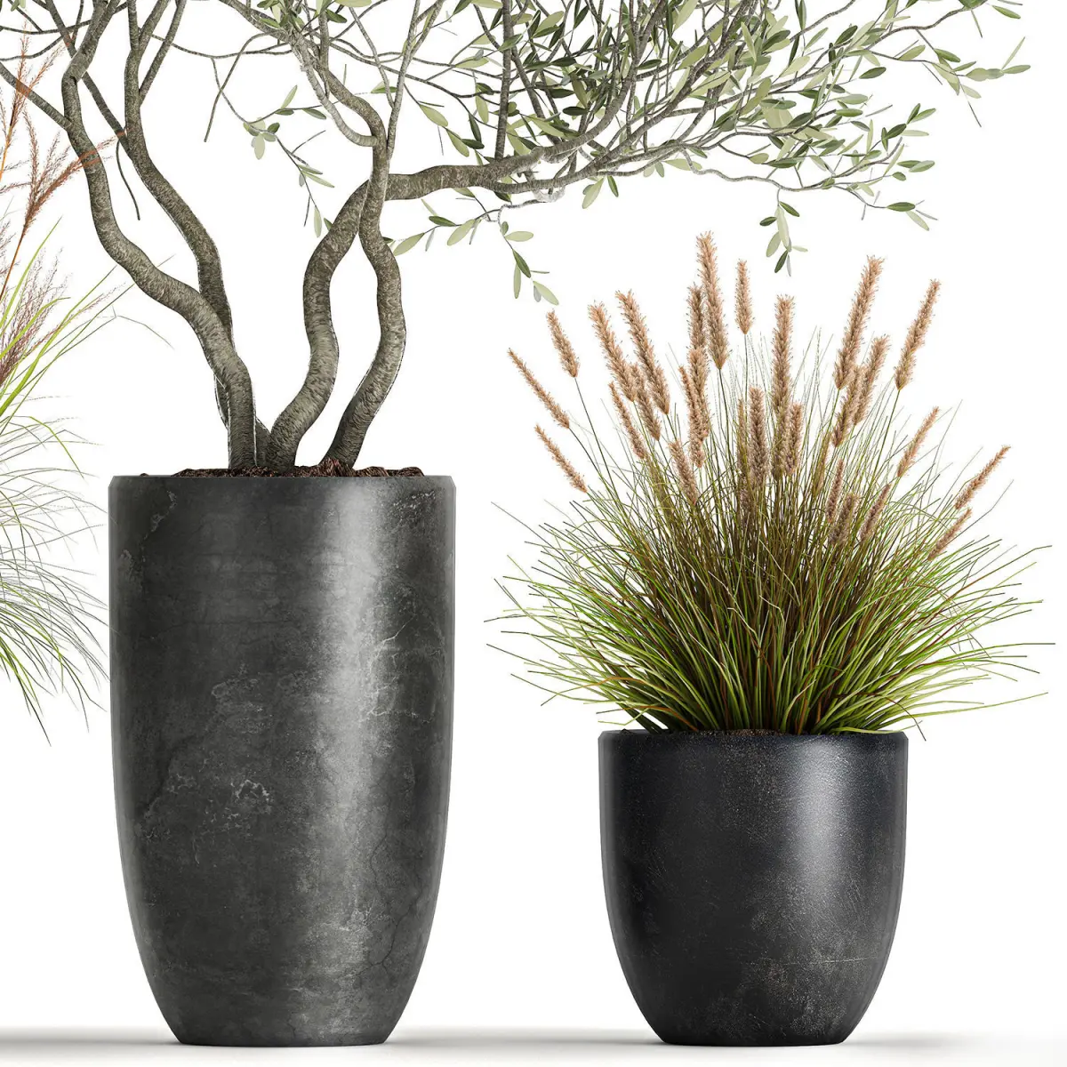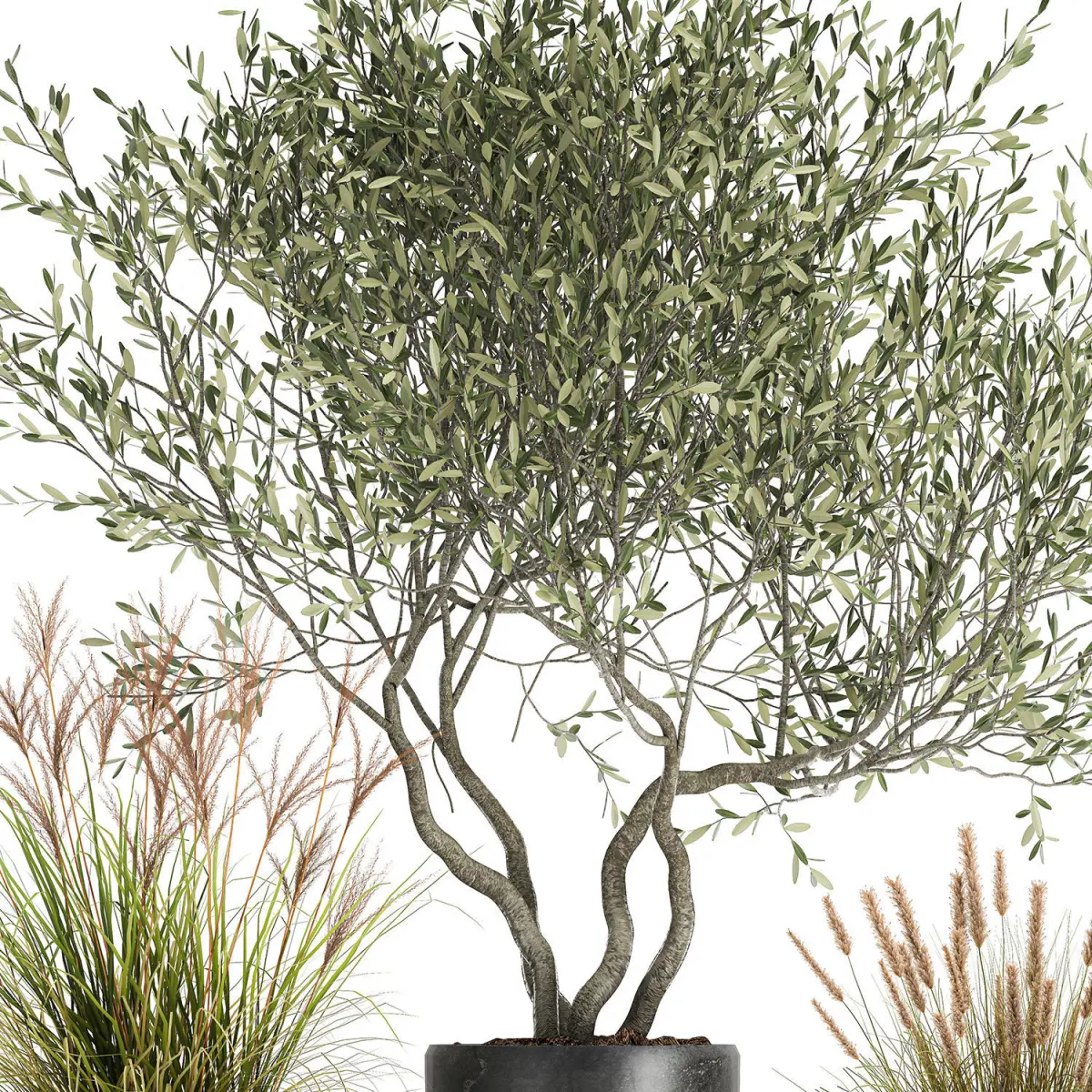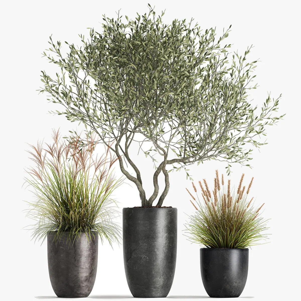 Ornamental plants for outdoor and interior in black pots.Houseplantsexotic plantsTropical plantsDecorative trees in flowerpotsOlea - OliveOlive treePennisetum alopecuroidesPennisetumScirpus - reeds