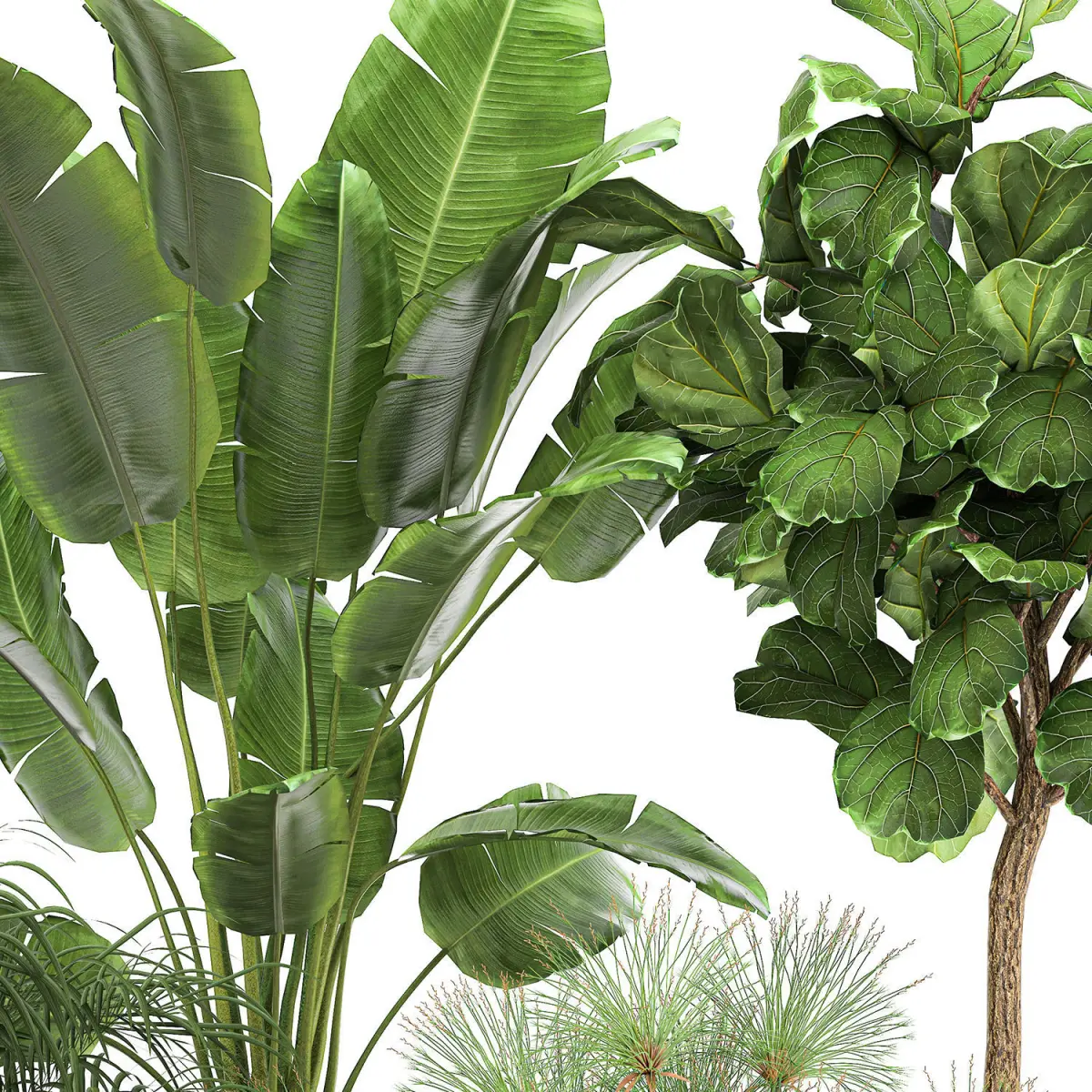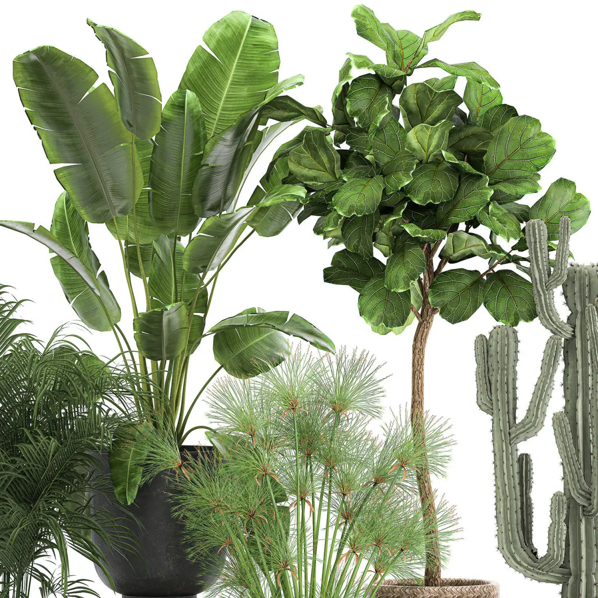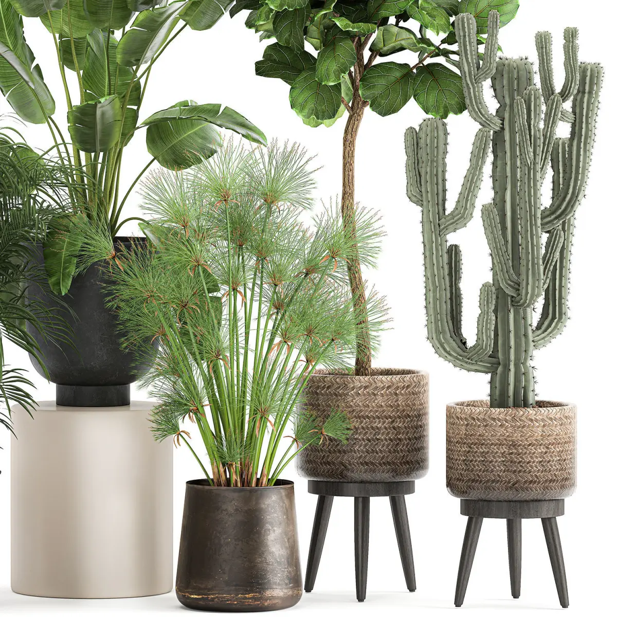 Ornamental plants for outdoor and interior design in metal pots.Rust, rusty flowerpot.Pot - RECLAIMED ARTIZAN IRON COPPA POTFlowerpot - Vig Planter L Set 2pcs, GrayFicus lyrata - Ficus lyrate, ficus Lyratatopiary, topiaryDecorative palm HoweaCarnegiea, Column Cactus, Saguaro Cactusbanana palmRavenala madagascariensisStrelitziaCyperus papyrus