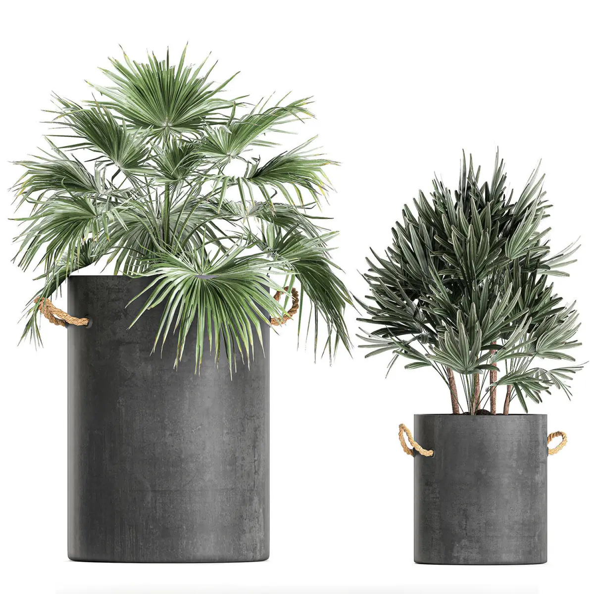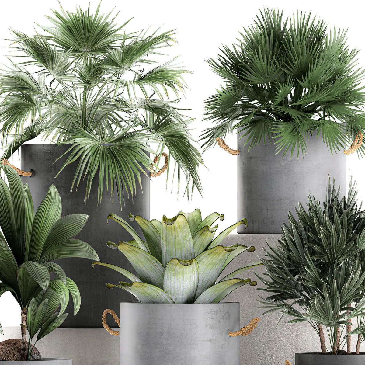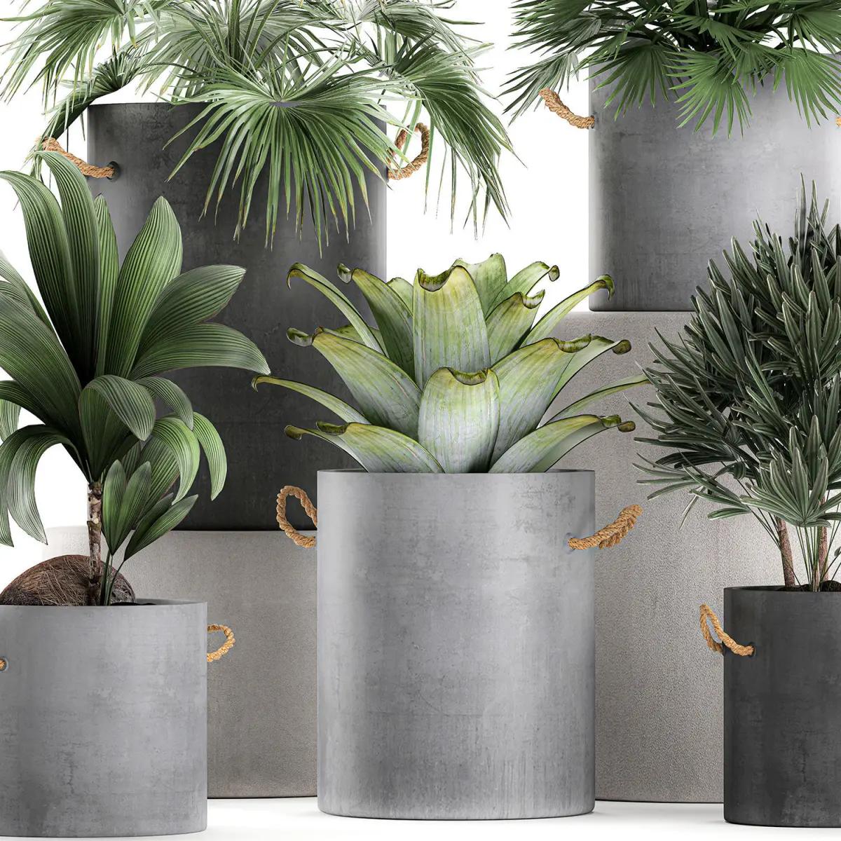 Decorative palm trees for the interior in pots of concrete.Houseplantsexotic plantsTropical plantsChamaerops palmRhapisyoung coconut treeCocos nuciferaLivistonaCoccothrinaxThrinaxbromelia