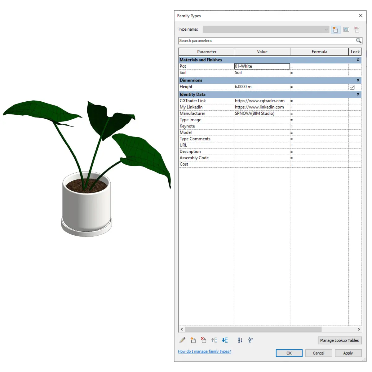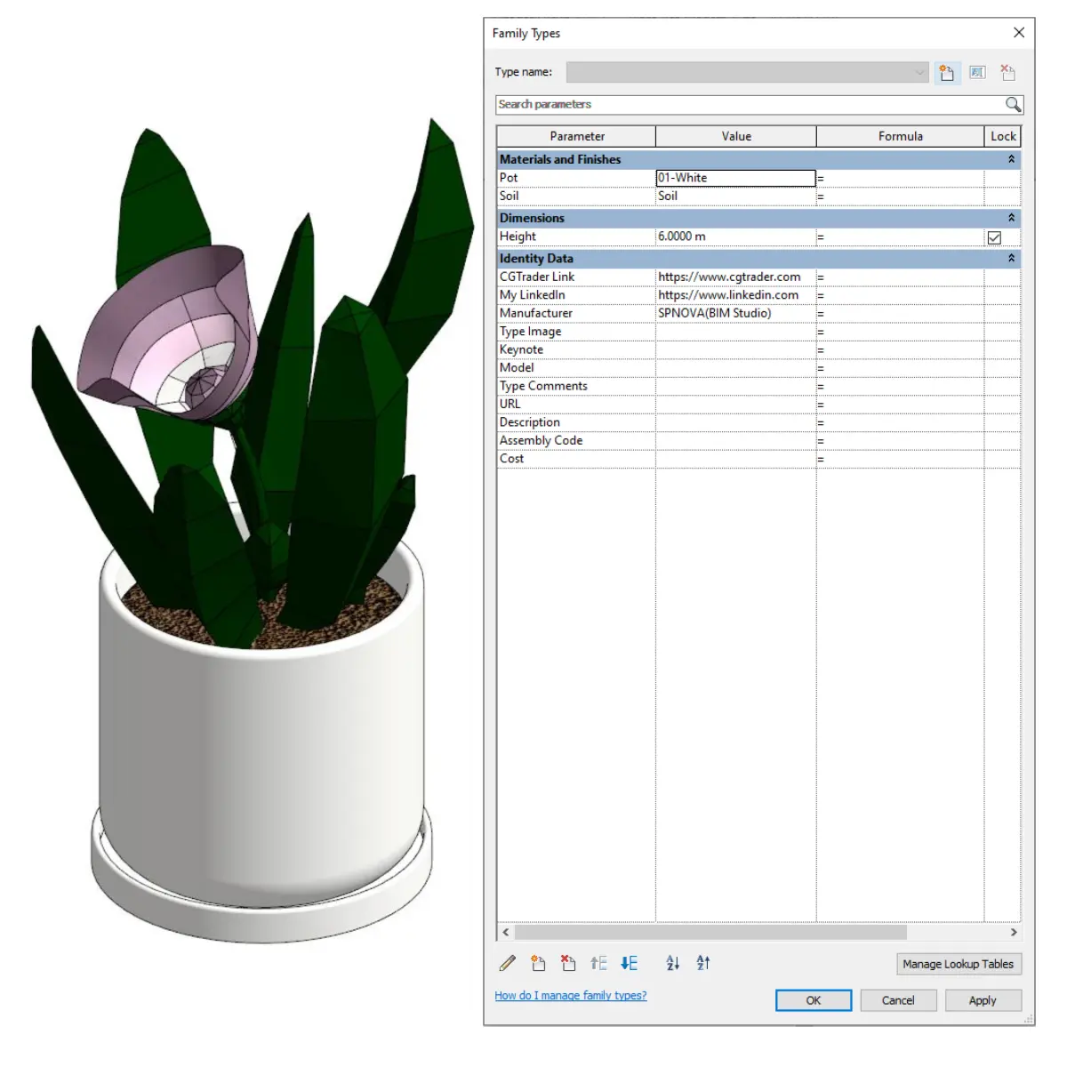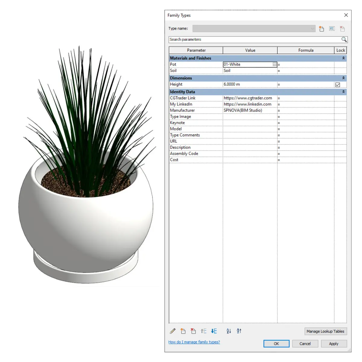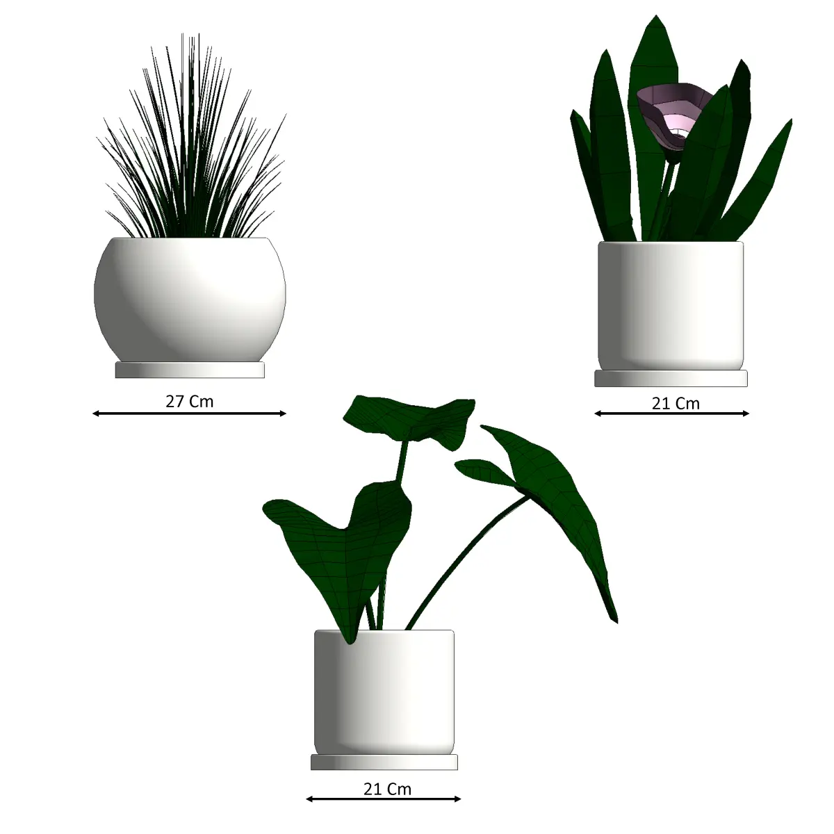 This Revit 2018 Family package includes 3 different indoor potted plants, each with a unique design. The pots are parametric in terms of material, allowing you to change their appearance easily. The plants include a tropical leafy plant, a minimal grass-style plant, and a flowering Calla lily. These families are ideal for interior renderings and are ready to use in any project.