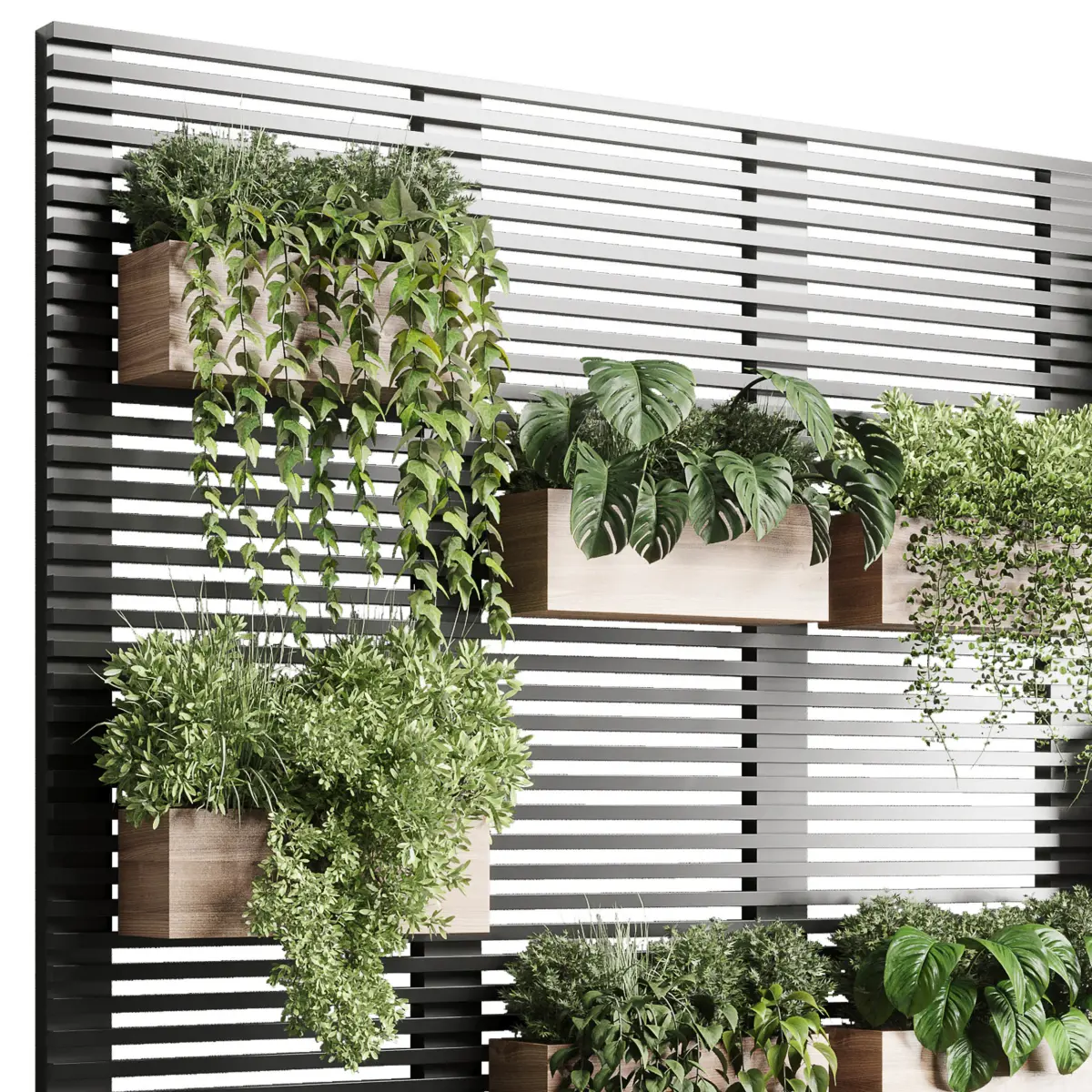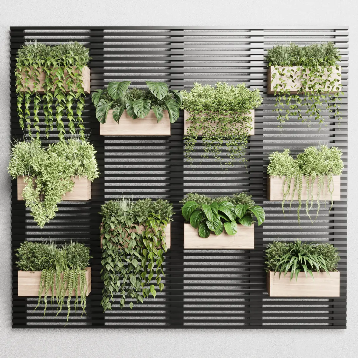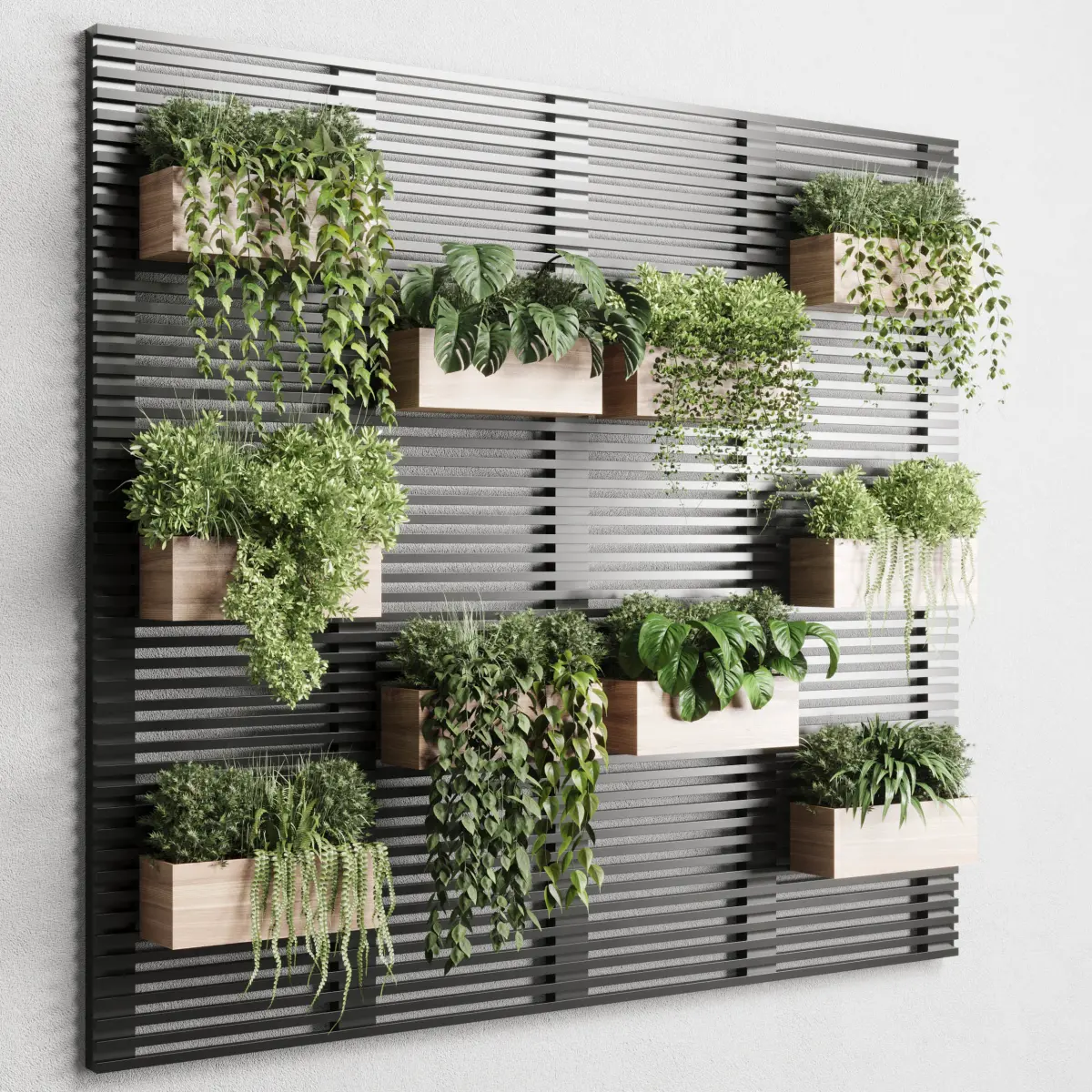plants set partition in metal frame - Vertical graden wall decor boxPlatform: 3dsMax 2015 + obj fbxRender: Vray+Corona Style: ModernMaterials: Organics