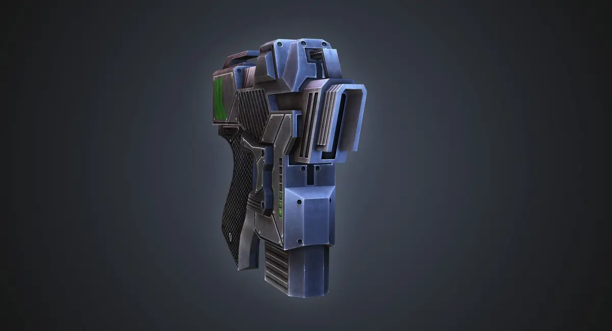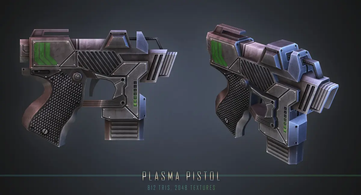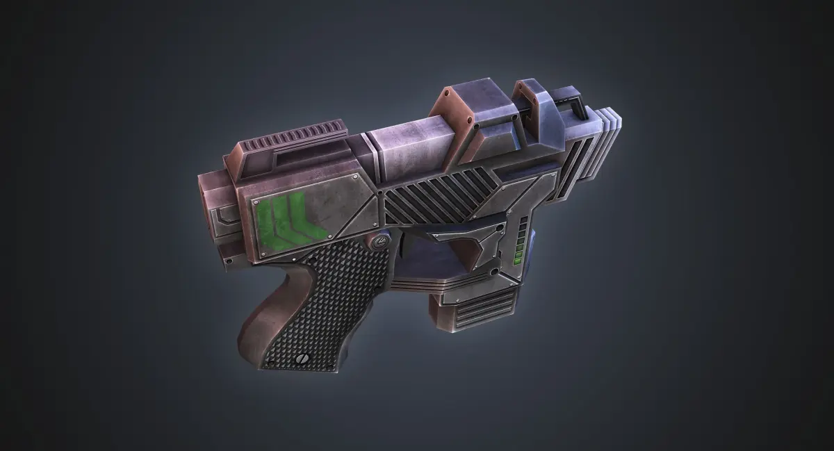 Low poly game style model of a sci-fi pistol. Perfect for third person shooters or FPS games with a poly budget. Uses 2048 x 2048 hand-painted diffuse, spec, and bump maps. Rendered in scanline with three omni lights. Model is one static object! Photoshop file is included if modifications to the texture are desired. Included formats: OBJ, FBX, and max.