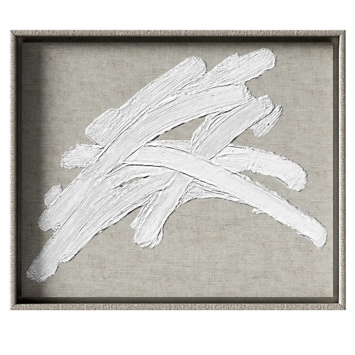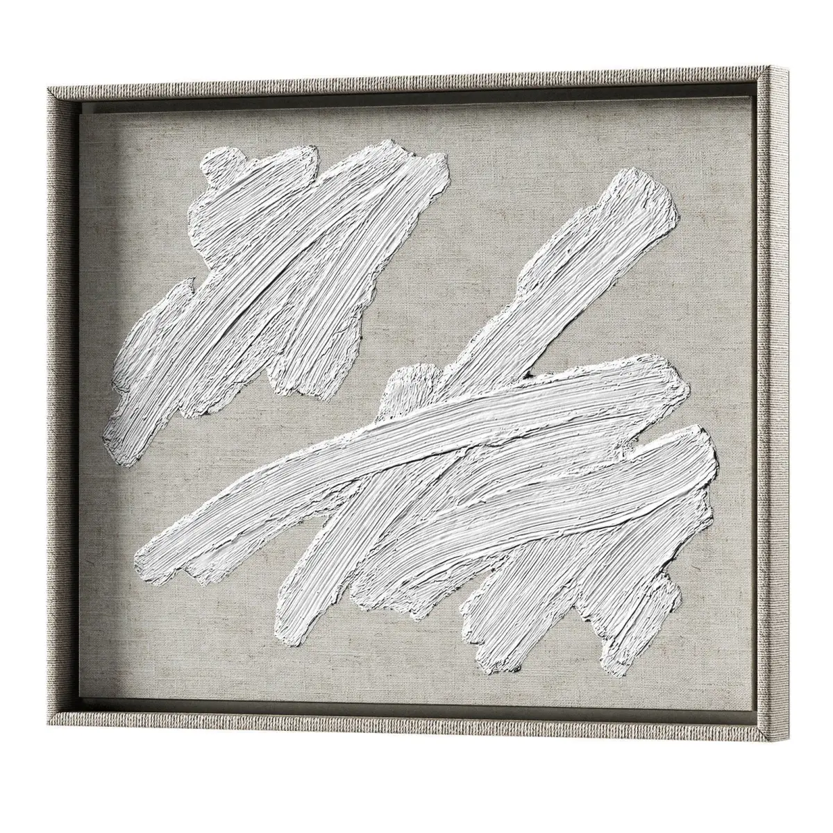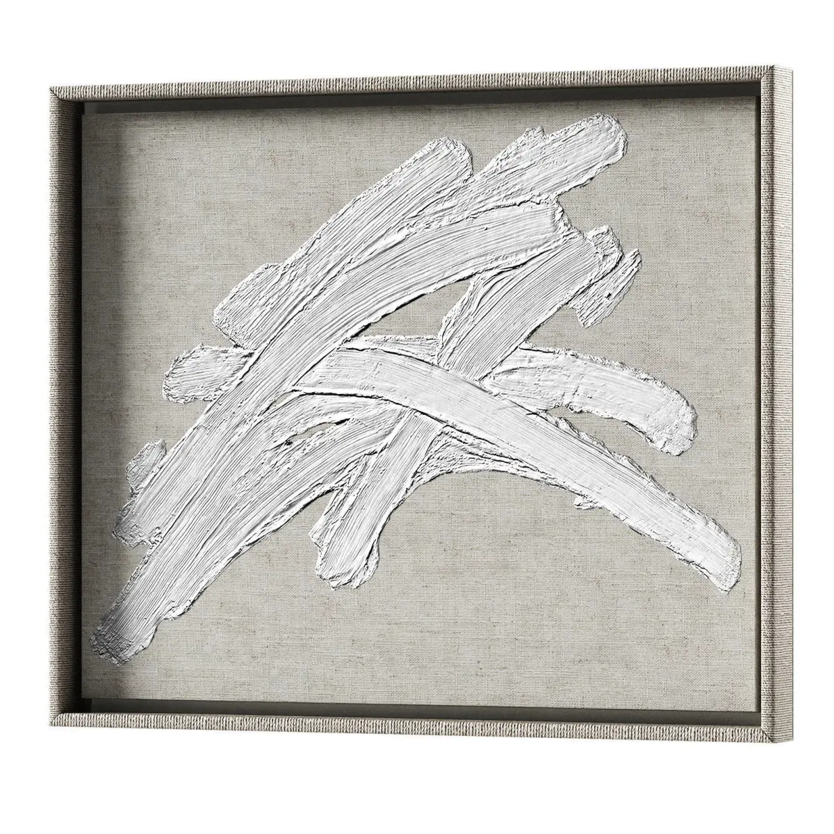 The 3D model contains three-dimensional designer wall decor.White plaster streaks, hand-applied onto linen fabric, are suspended in a wooden frame wrapped in rattan. Can be mounted horizontally and vertically.